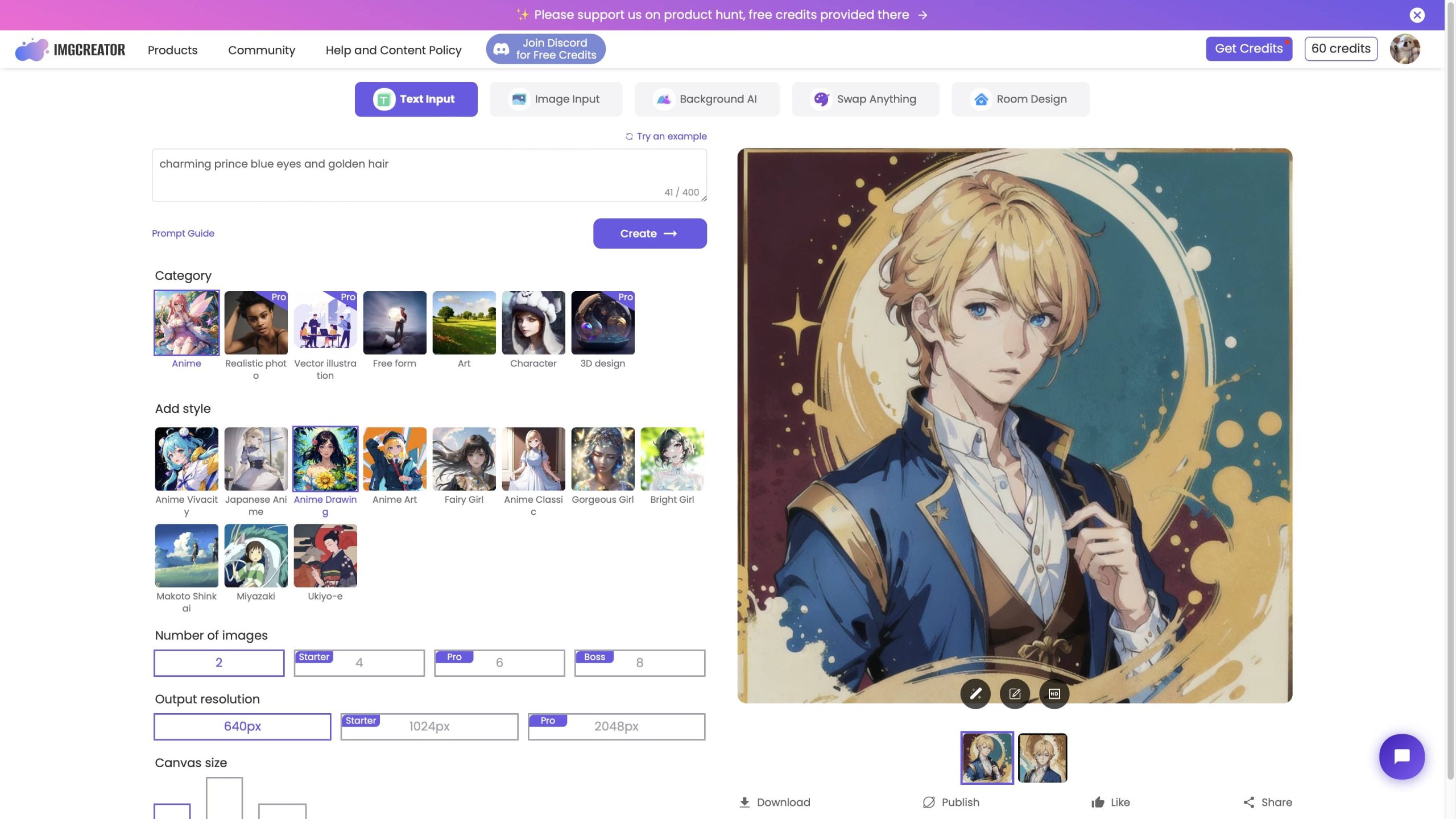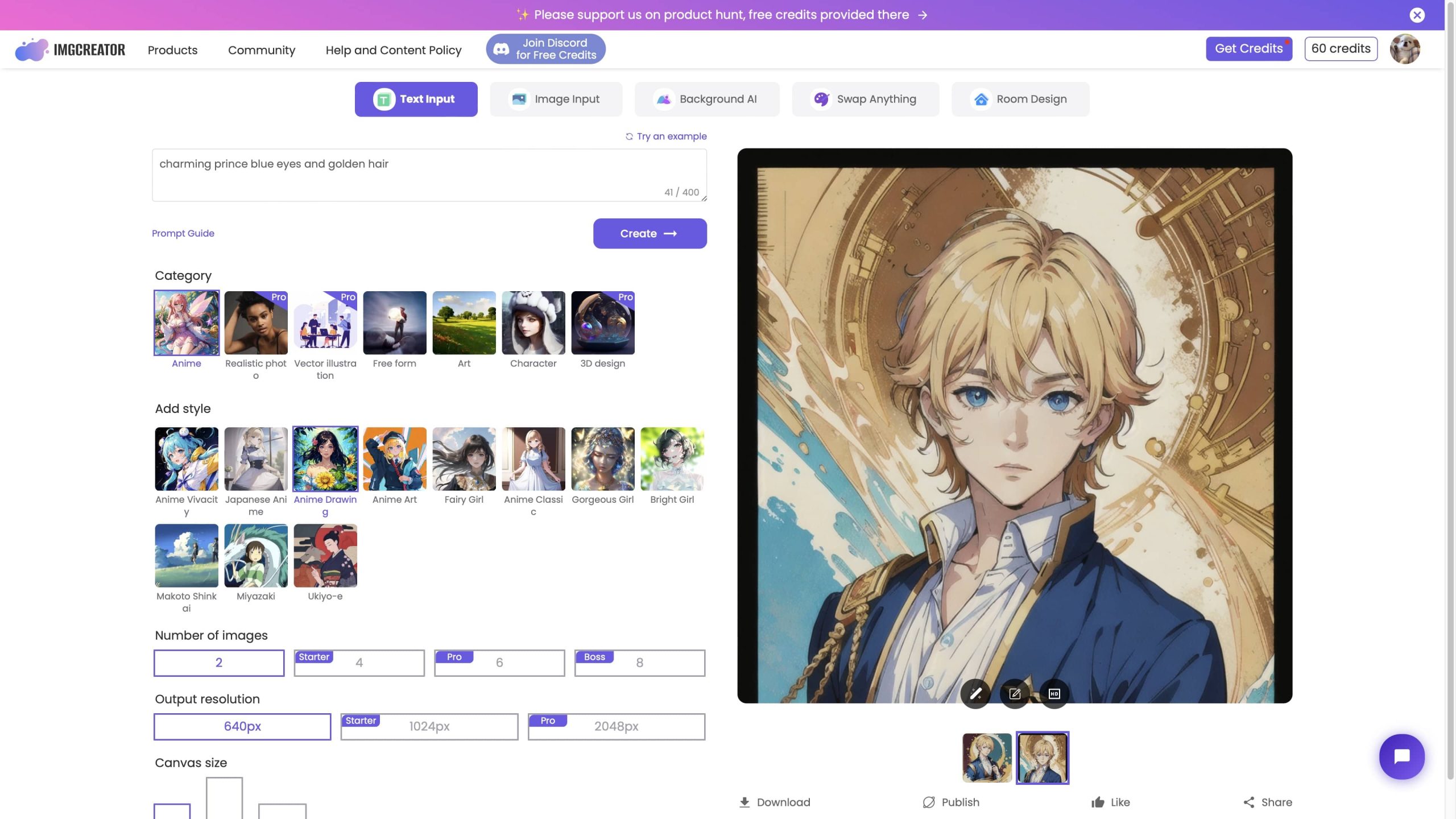 พอมาหน้าที่หน้าเว็บให้เราพิมคำที่ต้องการให้ AI สร้างเป็นภาพให้เราได้เลย และยังสามารถเลือกลักษณะและสไตล์ภาพที่ต้องการทำออกมาได้อีกด้วย อย่างเช่น ของทีมงาน “charming prine blue eyes and gloden hair”