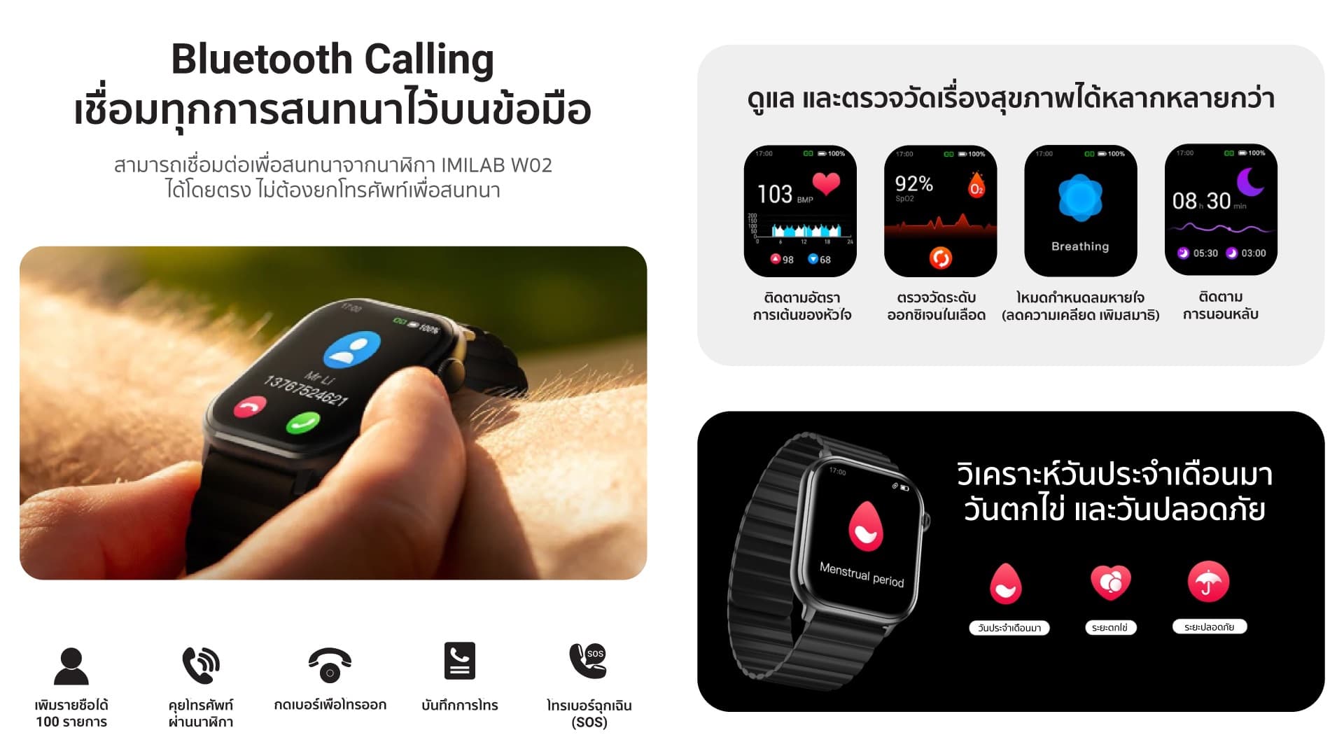 เชื่อมทุกการสนทนาไว้บนข้อมูลด้วย Bluetooth Calling โทรเข้า-ออก และปฏิเสธสาย ผ่านตัวเครื่องได้เลย กดเบอร์เพื่อโทรออก บันทึกการโทร เพิ่มรายชื่อได้ 100 รายการ และโทรเบอร์ฉุกเฉินได้ ดูแลคุณได้มากกว่า ด้วยการตรวจอัตราการเต่นของหัวใจ, วัดระดับออกซิเจนในเลือด, โหมดกำหนดลมหายใจ ลดความเครียดเพิ่มสมาธิ, ติดตามการนอนหลับ และสำหรับผู้หญิงยังวิเคราะห์วันประจำเดือนมา วันตกไข่ และวันปลอดภัย