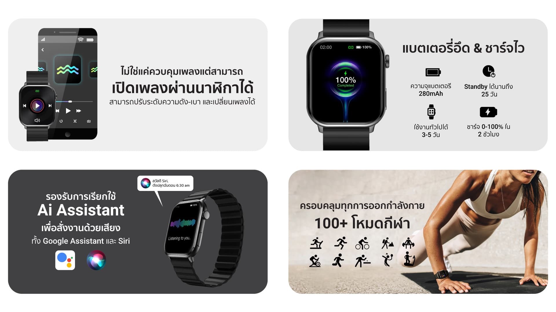 ไม่ใช่แค่ควบคุมเพลง แต่ที่ตัวเครื่องมีลำโพงที่สามารถฟังเพลงผ่านนาฬิกาได้เลย!! (ปรับระดับความดัง-เบา และเปลี่ยนเพลงได้) รองรับการสั่งงานด้วยเสียง Ai Assistant ทั้ง Google Assistant และ Siri ถูกใจสายออกกำลังกายด้วยโหมดกีฬามากว่า 100 โหมด พร้อมแบตอึด Standby ได้ถึง 25 วัน ใช้งานทั่วไป 3-5 วัน พร้อมชาร์จไวเพียง 2 ชั่วโมงจากแบตหมดถึงเต็ม!!
