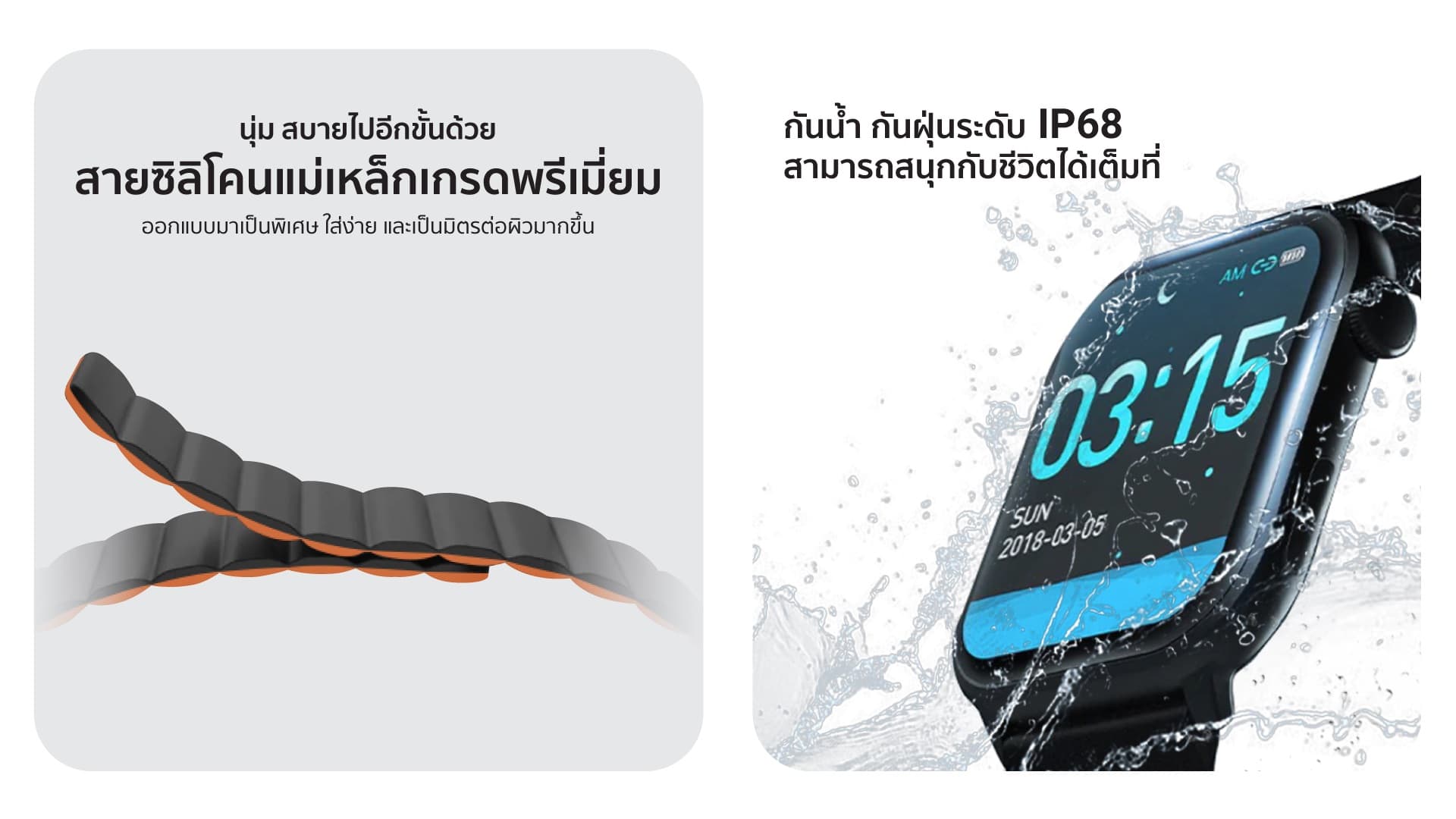 สายแบบใหม่ เป็นแม่เหล็กหุ้มด้วยซิลิโคนเกรดพรีเมี่ยม เป็นมิตรต่อผิว สวมใส่ง่าย สบาย แค่แปะประกบกันก็ติดแน่น คล่องตัวกว่าเดิม ลุยได้เต็มที่ด้วยการกันน้ำกันฝุ่น ระดับ IP68 ป้องกันในน้ำลึกสูงสุด 1.5 เมตรเป็นเวลาครึ่งชั่วโมง