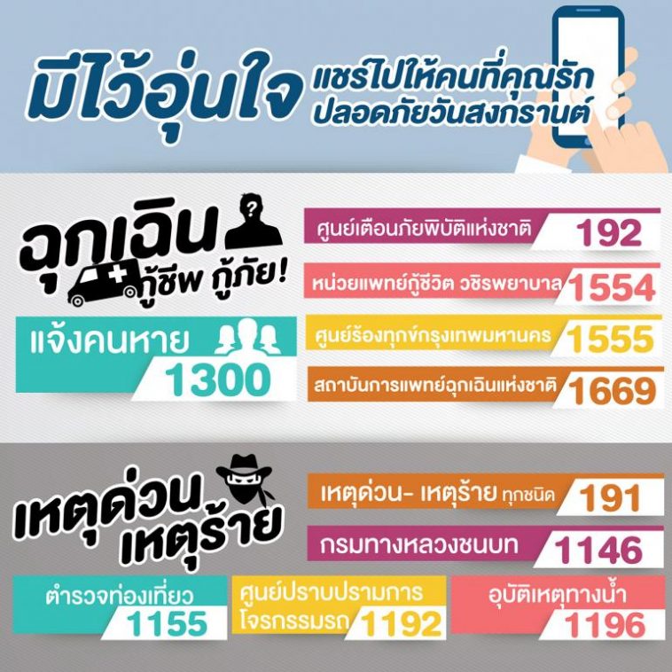 เอาหละแน่นอนว่าเทศกาลหยุดยาวขนาดนี้หลายคนคงต้องเดินทาง, ไปเที่ยวต่างจังหวัดหรือแม้กระทั่งอยู่บ้าน หากเกิดกรณีฉุกเฉินสิ่งที่จำเป็นอีกอย่างก็คือเบอร์ติดต่อกับส่วนที่เกี่ยวข้อง ทางทีมไทยรัฐได้รวบรวมเอาไว้ให้ดังนี้ครับ