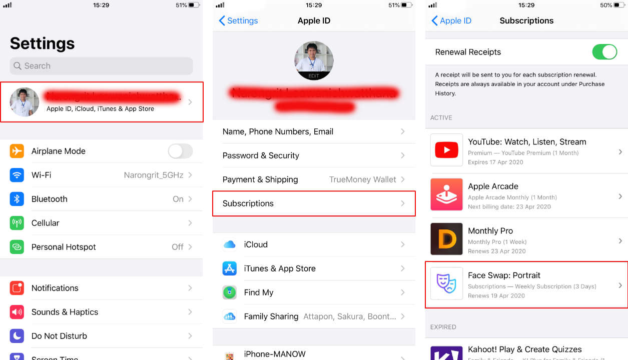 1. ไปที่ Settings >> Apple ID >> Subscriptions
