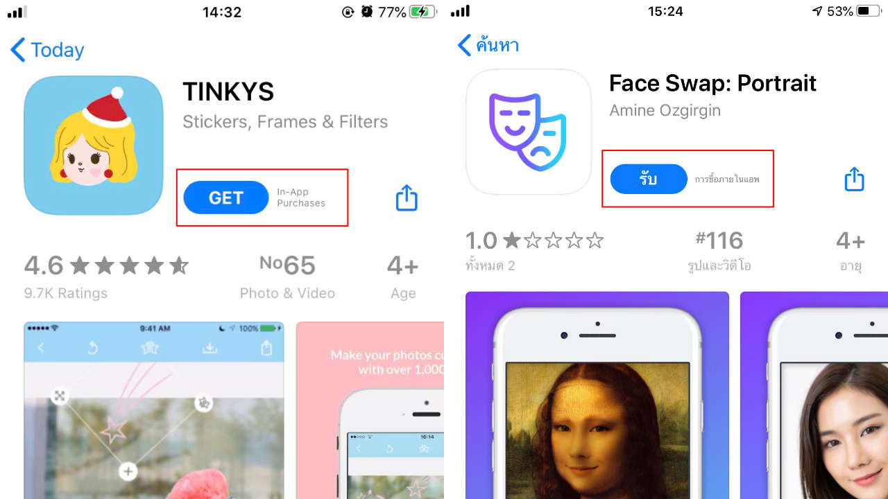 เช่น แอป TINKYS ที่เปิดให้โหลดฟรี ใช้งานฟรี แต่ต้องซื้อสติกเกอร์หรือเฟรมลายสวยๆ เพิ่ม หรือแอป Face Swap ที่ปล่อยให้ใช้งานฟรี 3 วัน แล้วต้องจ่ายสัปดาห์ละ 429 บาท เป็นต้น