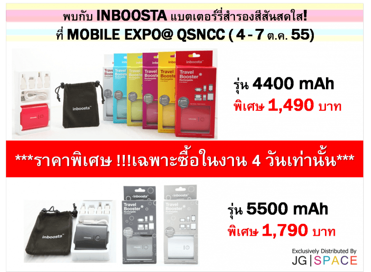 ใครมีโอกาสได้ไปเดินงาน Thailand Mobile Expo 2012 กันมาแล้วบ้างครับ เป็นไงบ้างมีของเยอะไหมเอ่ย? ผมว่าวันแรกและวันพรุ่งนี้คนน่าจะไม่เยอะเท่าไหร่เพราะยังทำงานอยู่จะไปเยอะอีกทีก็วันที่ 6-7 คือเสาร์ อาทิตย์โน่นแหละ รอบนี้มีข่าวจากผู้ใหญ่ใจดีของเราอีก 1 รายคือ JGSPace ผู้จัดจำหน่ายแบตสำรองวำหรับ iPhone, iPod touch, iPad จาก Inboosta ก็ได้จัดโปรต้อนรับงานนี้เช่นกัน