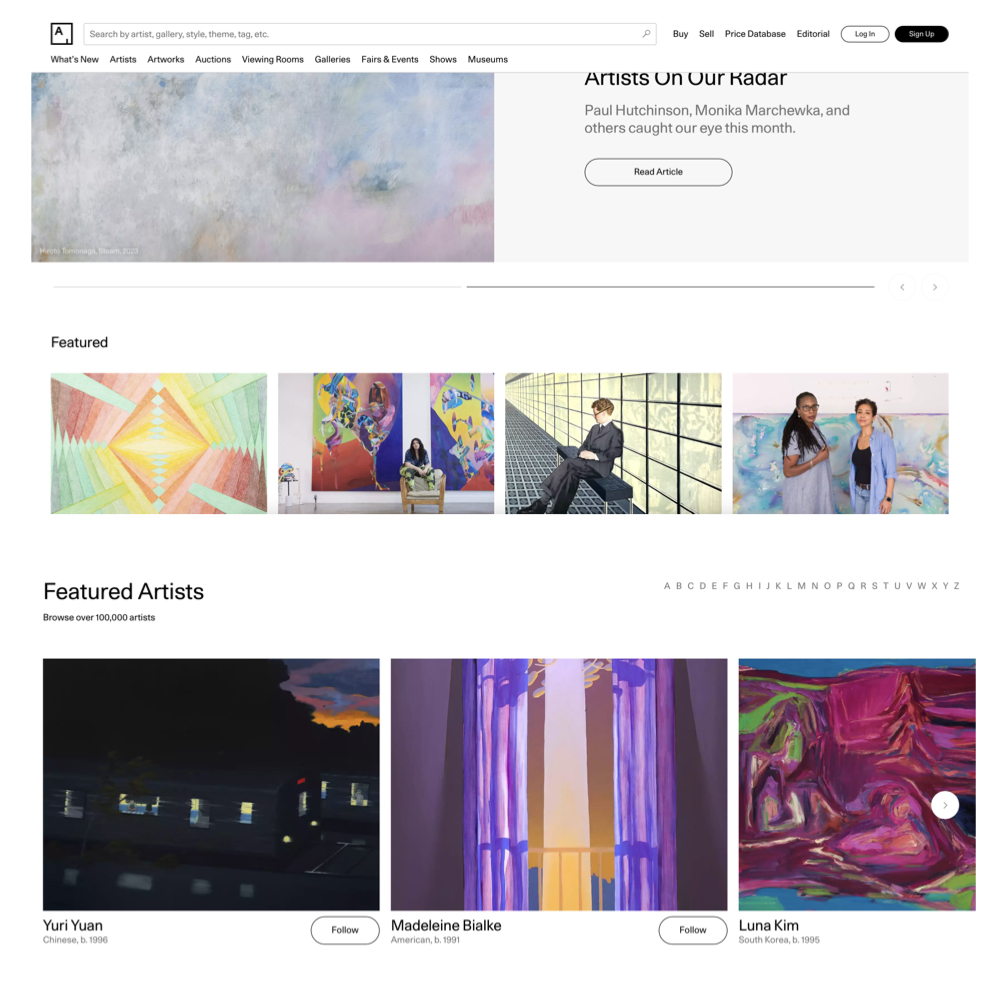 Artsy เป็นเว็บไซต์ที่รวมผลงานศิลปะหลากหลายรูปแบบจากทั่วโลก ไม่ว่าจะเป็นภาพวาด ประติมากรรม และผลงานศิลปะร่วมสมัย เว็บไซต์นี้ช่วยให้ผู้ใช้สามารถค้นหาศิลปิน แกลเลอรี่ และนิทรรศการที่กำลังจัดอยู่ได้ อีกทั้งยังสามารถซื้อ และขายผลงานศิลปะผ่านแพลตฟอร์มนี้ได้อีกด้วย