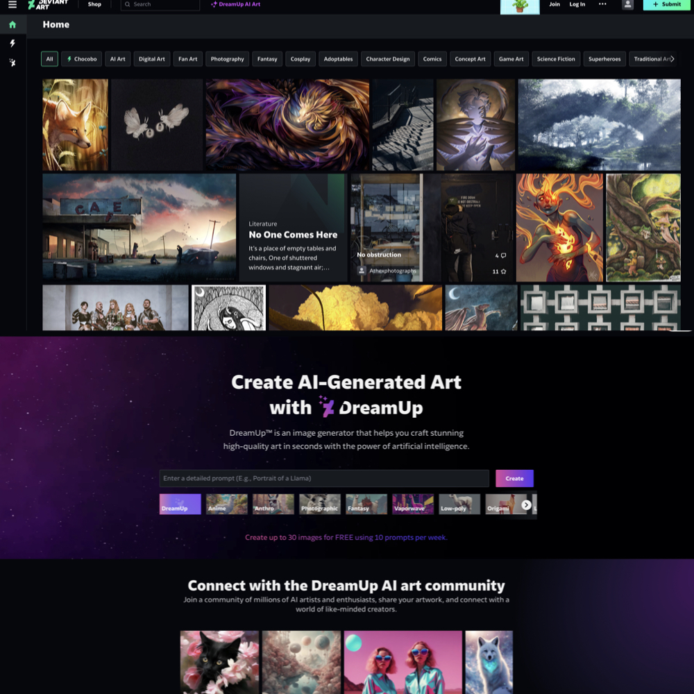 DeviantArt เป็นชุมชนออนไลน์ที่ใหญ่ที่สุดสำหรับศิลปินจากทั่วโลก เพื่อแบ่งปันผลงานศิลปะ ไม่ว่าจะเป็นดิจิทัลอาร์ต ภาพวาด ภาพถ่าย และอื่น ๆ อีกทั้งยังมีกิจกรรม และการท้าทายต่าง ๆ ที่ช่วยส่งเสริมการมีส่วนร่วมของศิลปินในชุมชนอีกด้วย