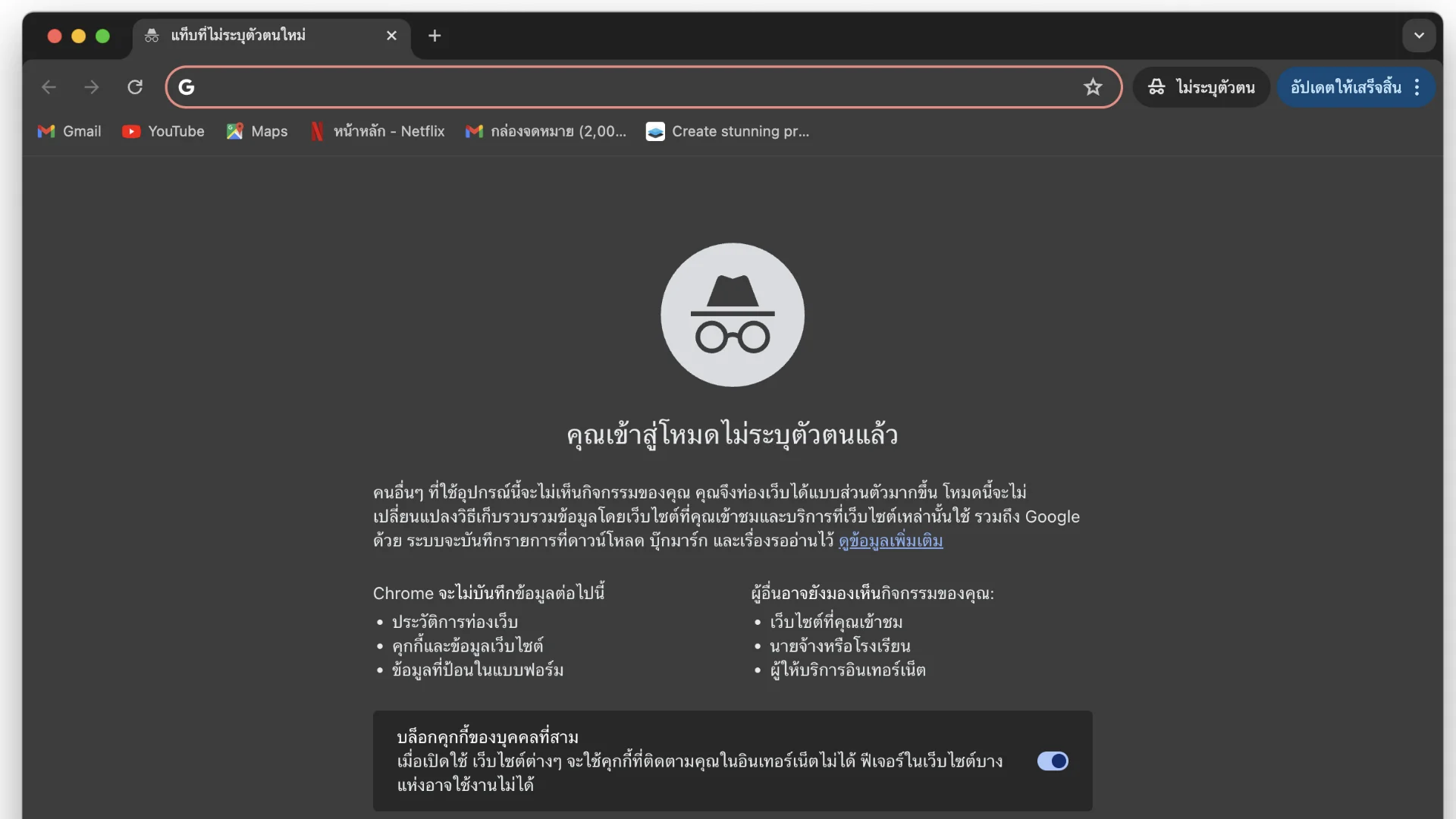 เมื่อคุณเยี่ยมชมเว็บไซต์ต่าง ๆ เว็บไวต์เหล่านี้จะติดตามกิจกรรมของคุณด้วย “คุกกี้” การใช้โหมดไม่ระบุตัวตนจะช่วยหลีกเลี่ยงการเก็บคุกกี้และประวัติการท่องเว็บของคุณได้