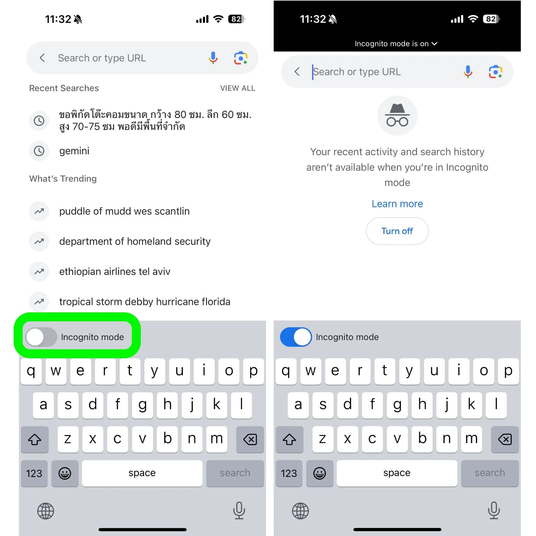 ให้คุณแตะที่ช่องค้นหา บนแป้นพิมพ์จะมีปุ่มให้เปิดใช้งานโหมดนี้อยู่ เมื่อเปิดใช้งานคุณก็สามารถท่องเว็บตามใจได้เลย