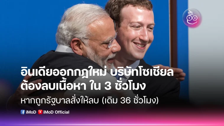 รัฐบาลอินเดียประกาศว่าบริษัทโซเชียลมีเดียต้อง ลบเนื้อหาโซเชียล ที่ผิดกฎหมายออกภายใน 3 ชั่วโมงหลังได้รับแจ้ง ซึ่งเป็นการปรับลดเวลาจากเดิมที่กำหนดไว้ 36 ชั่วโมง โดยการเปลี่ยนแปลงนี้อาจสร้างความท้าทายในการปฏิบัติตามกฎให้กับ Meta, YouTube และ X