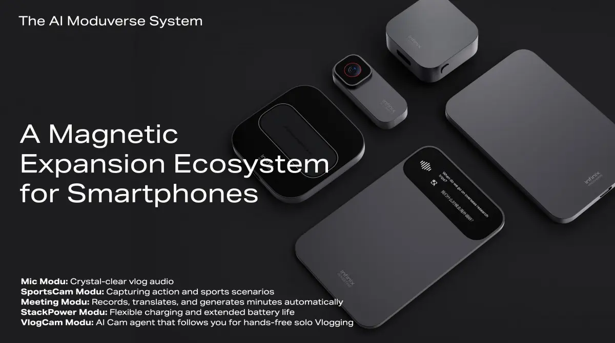 สุดท้าย Infinix ยังเปิดตัวระบบอุปกรณ์เสริมแม่เหล็กชื่อ ModuVerse โดยเปิดตัว 5 โมดูลแรกที่เชื่อมต่อกับสมาร์ตโฟนผ่านอินเทอร์เฟซแม่เหล็กเดียวกัน ได้แก่