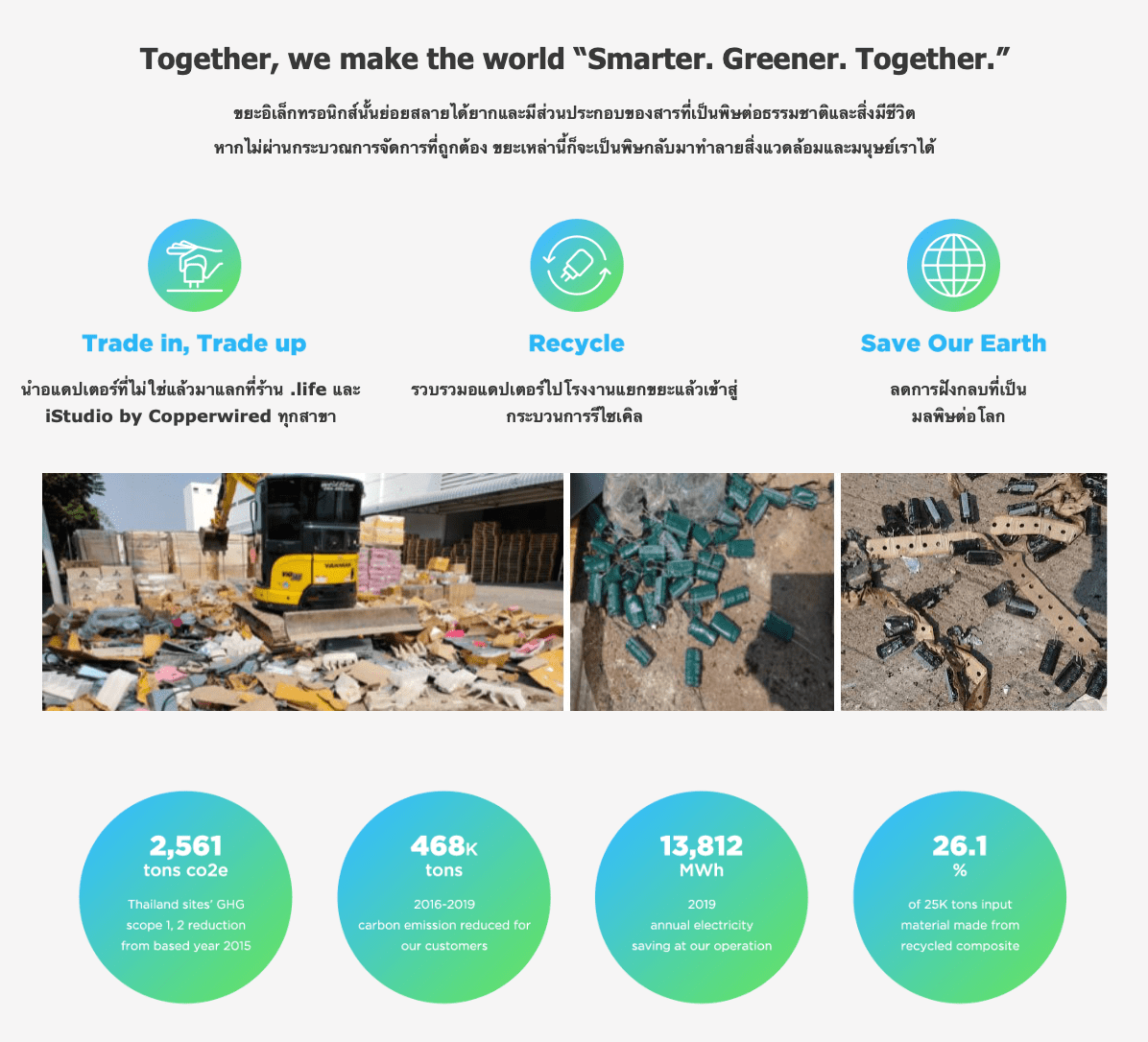 Innergie มุ่งมั่นที่จะปกป้องโลกร่วมกับลูกค้าและผู้ถือหุ้น จากรายงานของกรมควมคุมมลพิษ ปริมาณขยะอิเล็กทรอนิกส์ในประเทศไทยมีประมาณเกือบ 4 แสนตันต่อปี และมีแนวโน้มเพิ่มขึ้นต่อเนื่องทุกปี เป็นทวีคูณ