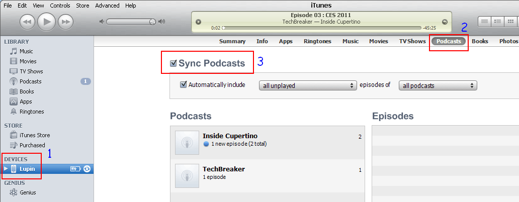 ถ้าจะ Sync ลง iPod, iPhone ให้กดที่ชื่อเครื่องเรา >> เลือก Podcasts >> ติ๊กถูกที่ Sync Podcasts >> กด Apply >> กด Sync