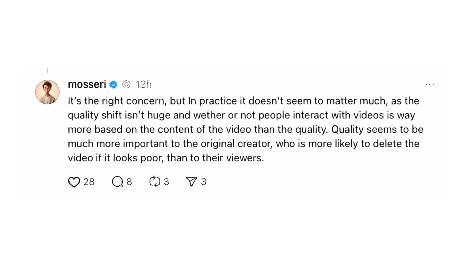 Adam Mosseri (ผู้บริหาร Meta ผู้ดูแล Instagram และ Threads) อธิบายว่า ” โดยทั่วไป เราต้องการแสดงวิดีโอคุณภาพสูงสุดที่เราสามารถทำได้ แต่ถ้าบางอย่างไม่ได้รับการรับชมเป็นเวลานาน เพราะฉะนั้นเราจะย้ายไปใช้วิดีโอคุณภาพต่ำกว่า และถ้ามันถูกดูซ้ำอีกมาก เราจะเรนเดอร์วิดีโอคุณภาพสูงอีกครั้ง ”