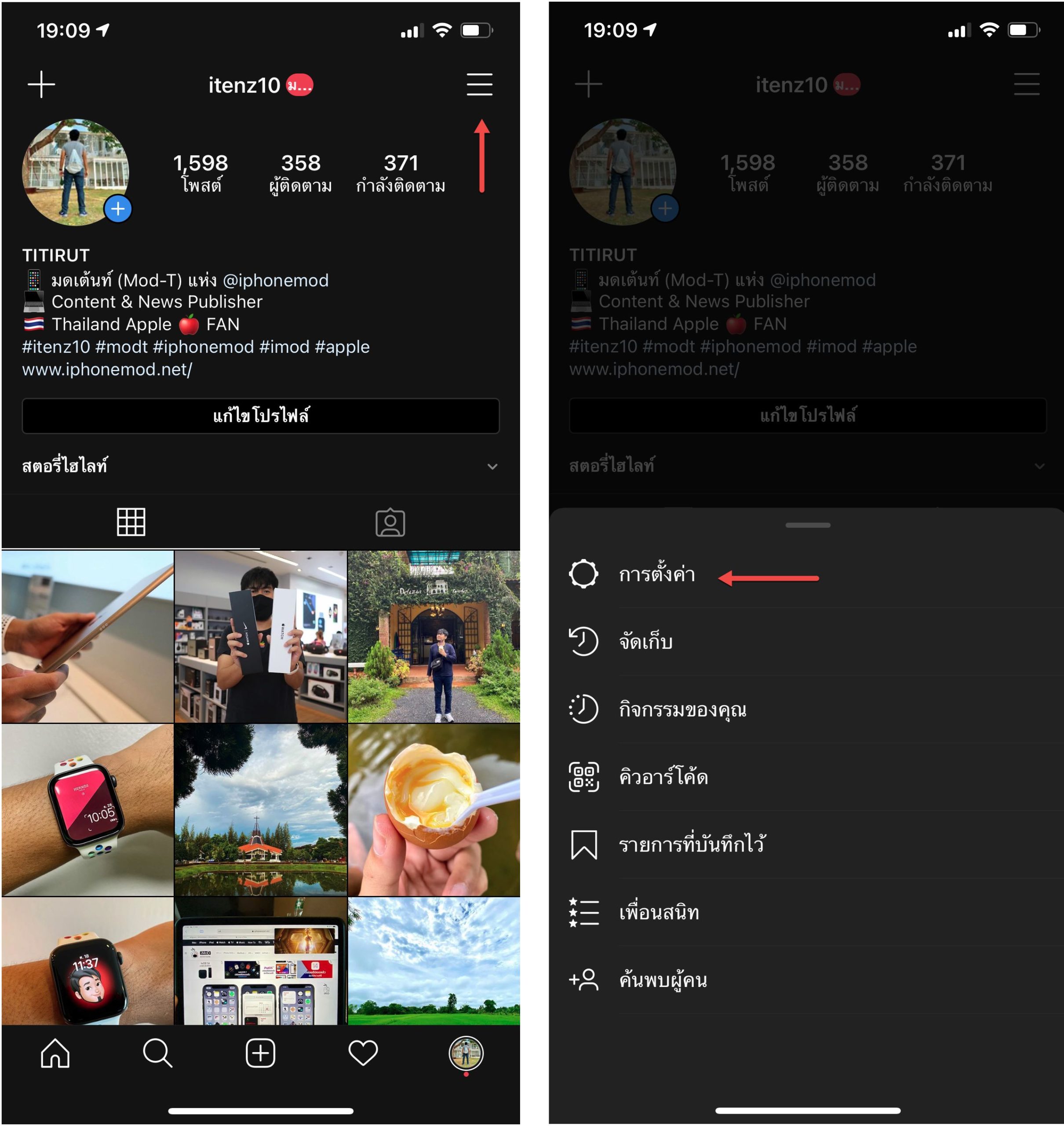 สำหรับการเปลี่ยนไอคอนแอป Instagram โดย เปิดแอป Instagram > แตะที่ 3 ขีดด้านบน > การตั้งค่า