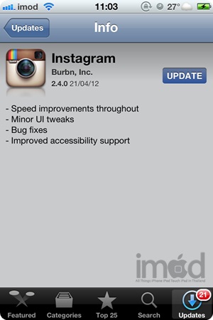 เห็นได้ชัดเจนช่วงการเรียกกล้องขึ้นมาถ่ายรูปนั้นทำงานได้เร็วขึ้น ซึ่งในเวอร์ชันก่อนหน้ากว่าจะเรียกกล้องได้ทีก็นานโขอยู่ทีเดียวสำหรับ iPhone 4 ที่ผมใช้งานอยู่และติดตั้งแอปไว้ค่อนข้างเยอะแต่ตอนนี้ถือว่าการทำงานดีขึ้นครับ หากใครชอบใช้งาน Instagram ก็สามารถอัปเดตกันได้ฟรีที่ App Store ไม่มีค่าใช้จ่าย
