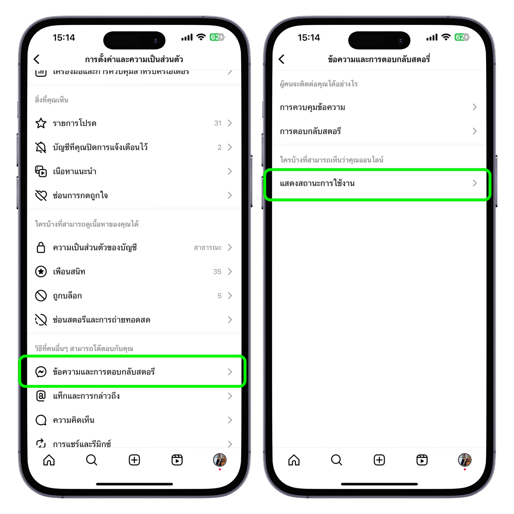 ไปที่เมนู ข้อความและการตอบกลับสตอรี่ > แสดงสถานะการใช้งาน