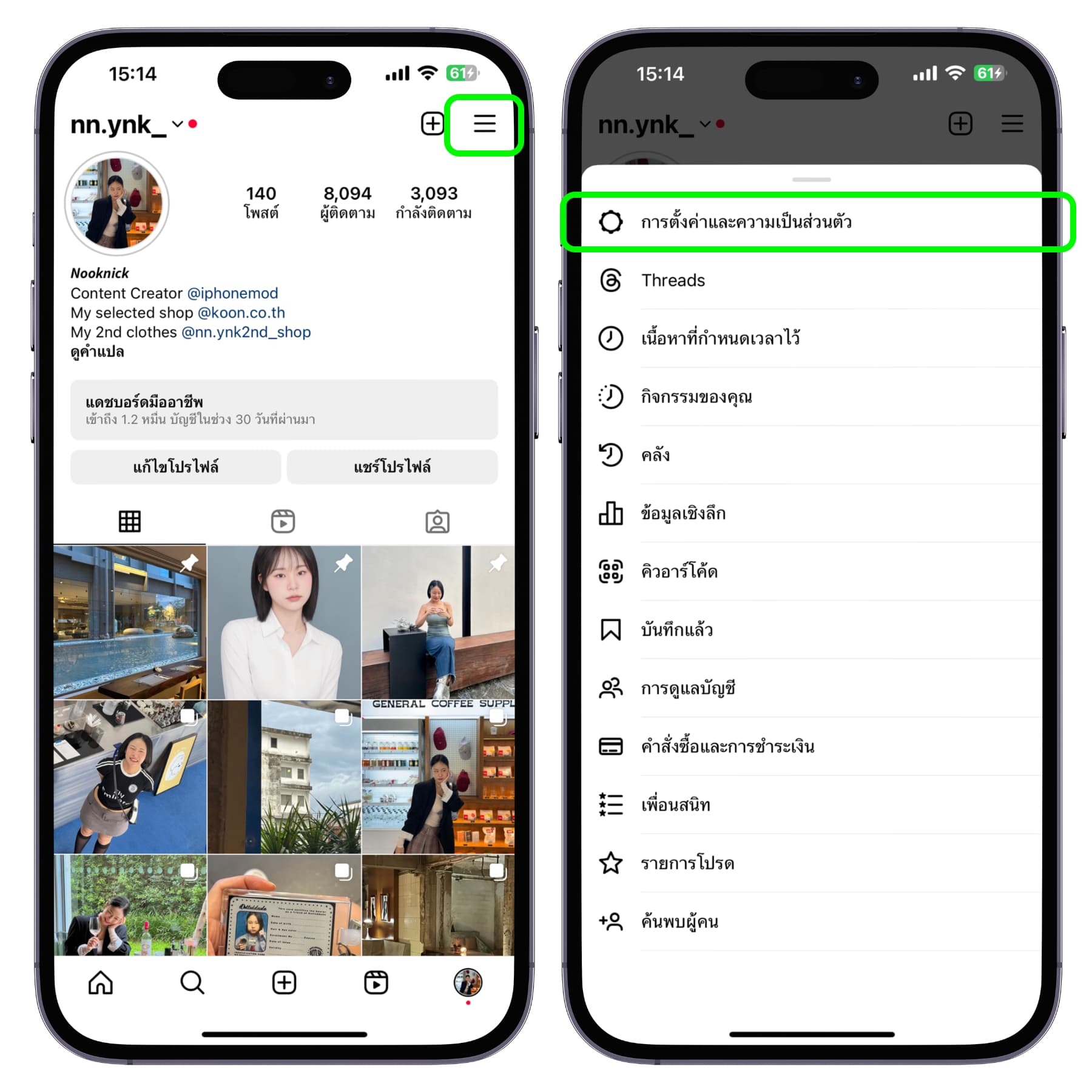 เปิดแอป Instagram ขึ้นมา จากนั้นไปที่หน้าโปรไฟล์ของเรา > แตะขีดสามขีด > เลือก “การตั้งค่าและความเป็นส่วนตัว”