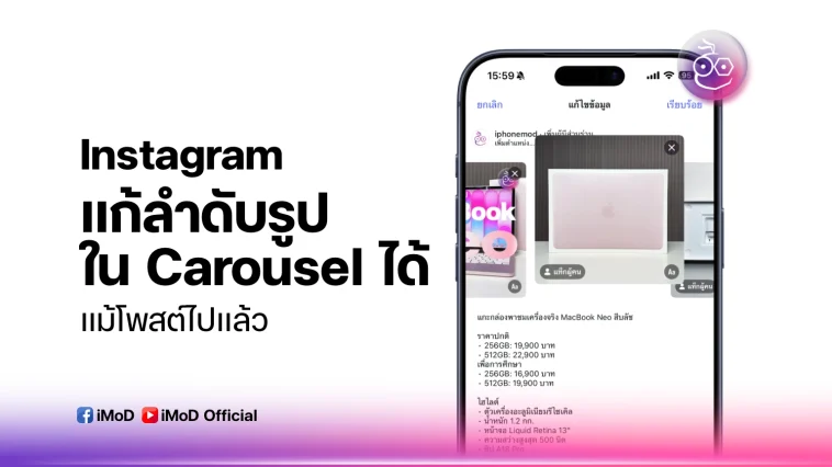 นั่นหมายความว่าหากผู้ใช้ Instagram โพสต์เนื้อหาแบบ Carousel ไปแล้ว แต่เรียงรูปผิด ก็ไม่ต้องลบแล้วโพสต์ใหม่อีกต่อไป สามารถแตะแก้ไข สลับลำดับได้เลย
