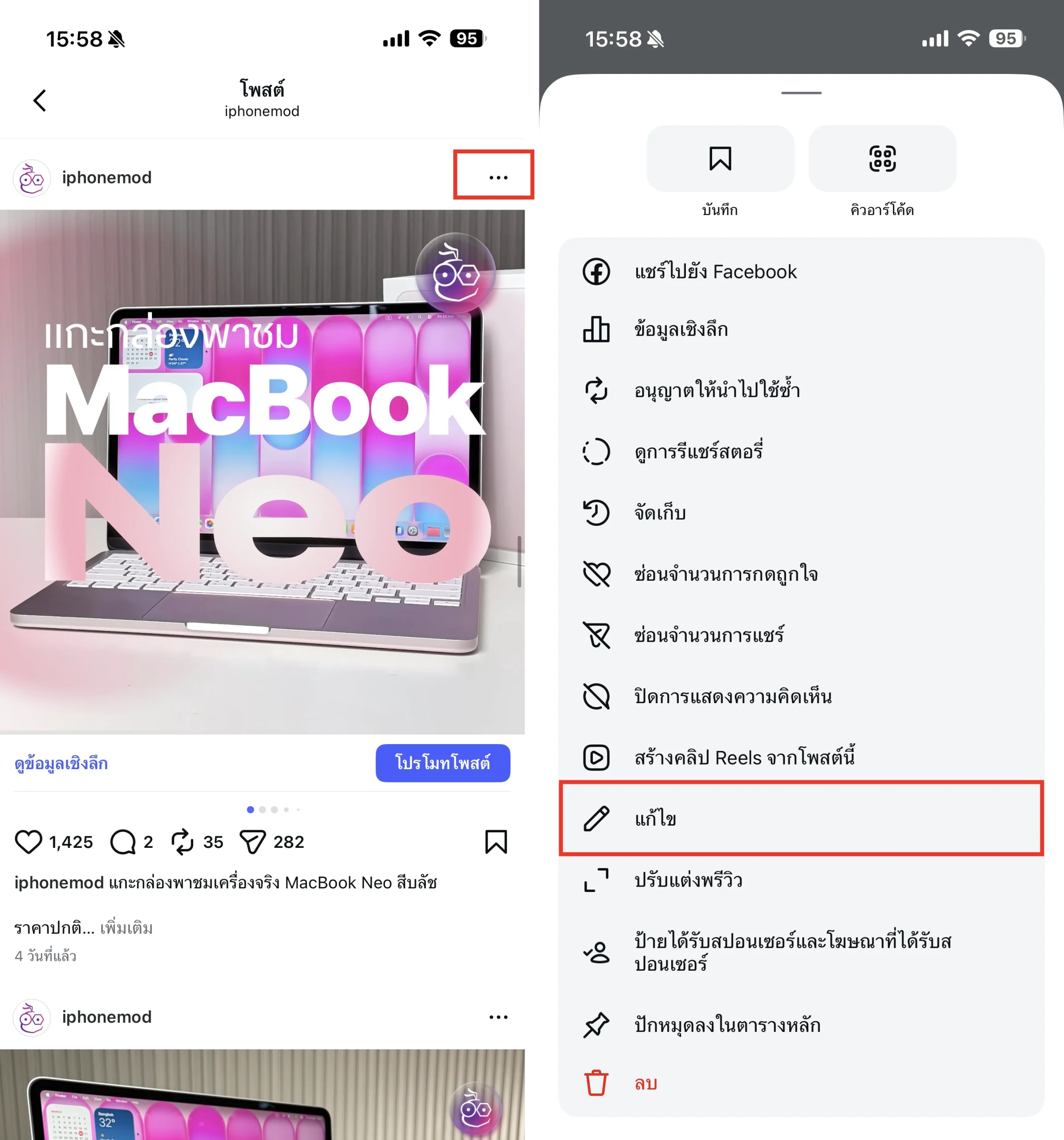 เลือกโพสต์ที่ต้องการ > แตะไอคอน … ที่มุมขวาบนของโพสต์ > แตะแก้ไข