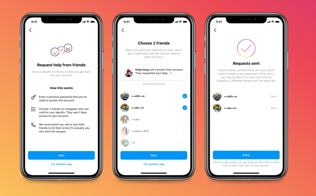 มีอัปเดตเพิ่มเติมว่า Instagram จะเริ่มทดสอบคุณสมบัติใหม่ที่ช่วยเหลือผู้ที่ไม่สามารถเข้าสู่บัญชีของตนเองได้ โดยจะอนุญาตให้ผู้ใช้ยืนยันตัวตนและเข้าถึงบัญชีของตนเองผ่านเพื่อนได้