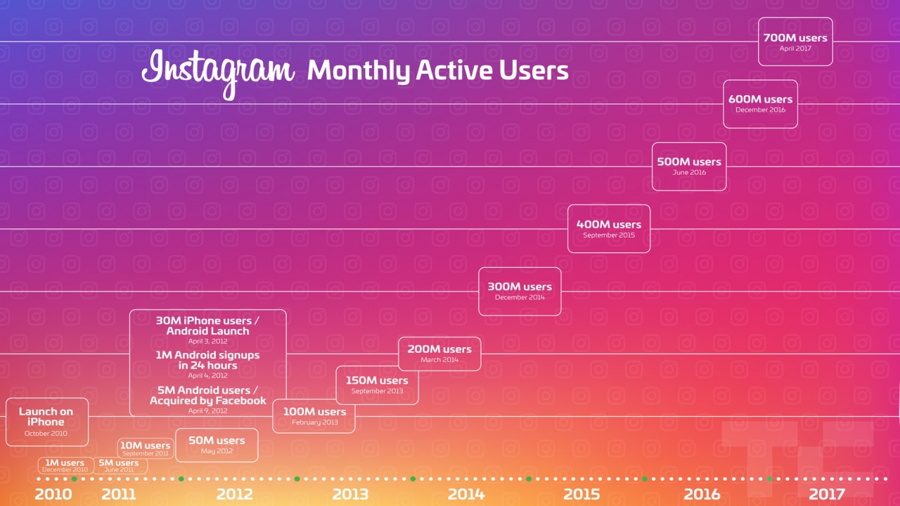 ในปี 2017 นี้แอป Instagram มีผู้ใช้งานมากกว่า 700 ล้าน Users แล้วในเดือนเม.ย. (กระโดดจากเดือน ธ.ค. 2016 มา 100 Users) โดยสื่อต่างประเทศบางกลุ่มวิเคราะห์ว่าแอป Instagram มีคุณสมบัติส่วนใหญ่ใกล้เคียงกับแอป Snapchat และแอป Facebook เองก็เริ่มนำคุณสมบัติบางอย่างใน Instagram มาใช้ด้วย