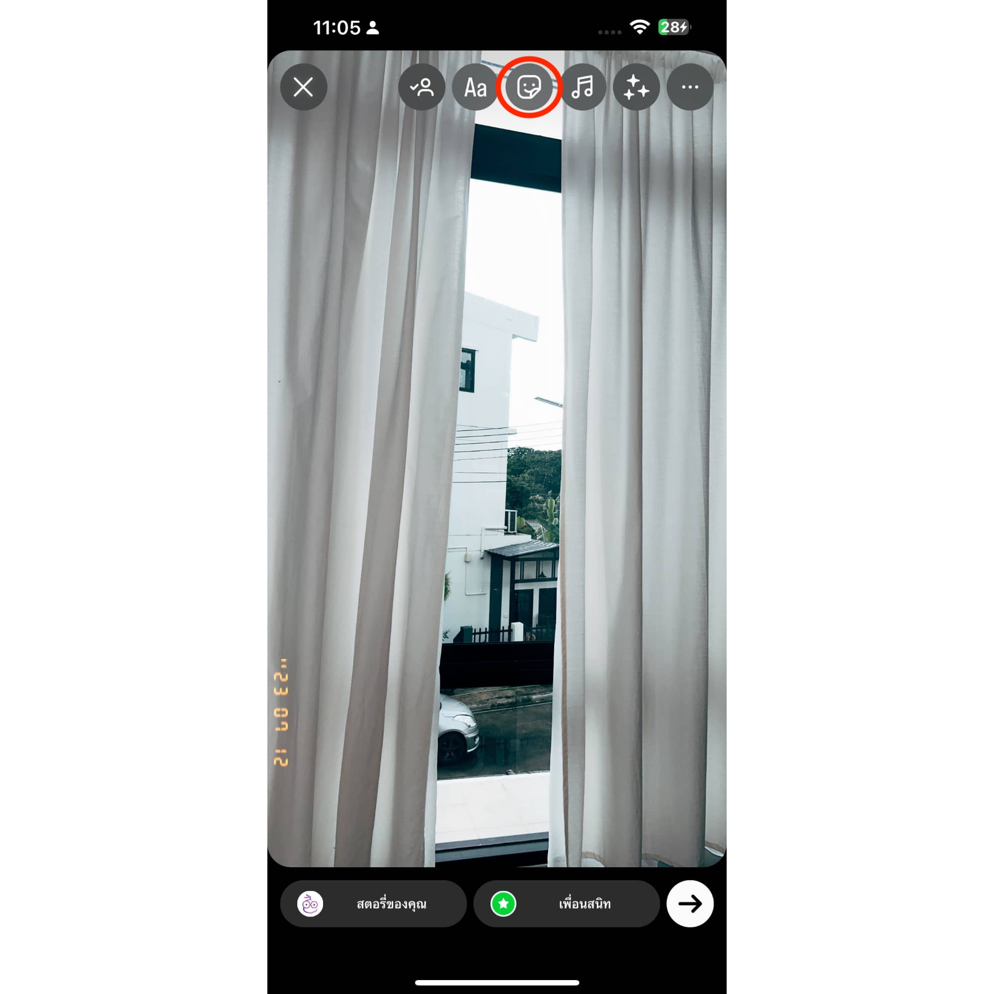 เข้ามาที่แอป Instagram แล้วเลือกรูป จากนั้นกด “สติ้กเกอร์ด้านบน”