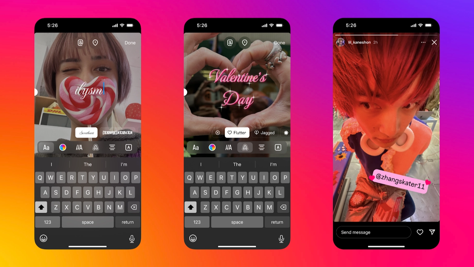 • ฟอนต์และเอฟเฟกต์ข้อความในธีมวันวาเลนไทน์: ยกระดับความสร้างสรรค์ในวันแห่งความรักของคุณบน Stories และ Reels ด้วยฟอนต์และเอฟเฟกต์ข้อความสำหรับวันวาเลนไทน์ที่ได้รับแรงบันดาลใจจากดีไซน์สไตล์เรโทร  นอกจากนี้ ยังสามารถใช้เอฟเฟกต์ข้อความสนุก ๆ ได้เมื่อแท็กเพื่อนของคุณใน Stories