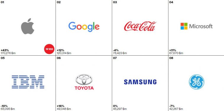 Apple มีมูลค่า $170,276 ล้านเหรียญสหรัฐ (เพิ่มขึ้น 43%) ในขณะที่คู่แข่งเบอร์หนึ่งอย่าง Google มีมูลค่าอยู่ที่ $120,314 ล้านเหรียญสหรัฐ (เพิ่มขึ้น 12%) โดยการคำนวณเกิดจากงบการเงินของบริษัท รวมทั้งความสามารถของแบรนด์ที่มีอิทธิพลต่อการซื้อของลูกค้า และขอบเขตที่จะสามารถกำหนดราคาพรีเมี่ยมได้ ส่วนทาง Microsoft อยู่ในลำดับที่ 4 (มูลค่าเพิ่มขึ้น 11%) และ Samsung อยู่ลำดับที่ 7 (มูลค่าไม่เปลี่ยนแปลง)