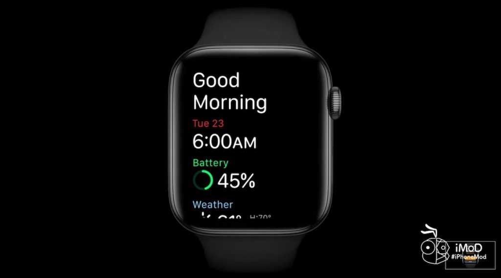 เมื่อตื่นนอนเรียบร้อยแล้ว Apple Watch ก็จะแสดงข้อมูลเวลาตื่นนอน เปอร์เซ็นต์แบตเตอรี่ สภาพอากาศ ให้ผู้ใช้ทราบ เพื่อเตรียมการชาร์จ และใช้ชีวิตประจำวันต่อไป