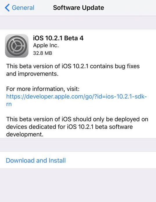 หลังจากที่ Apple ปล่อย iOS 10.2.1 Beta 3 ให้นักพัฒนาอัปเดตกัน ล่าสุด Apple ปล่อย iOS 10.2.1 Beta 4 ให้นักพัฒนาได้อัปเดตกันแล้ว โดยรอบนี้เป็นการอัปเดตแก้ไขข้อบกพร่องและปรับปรุงประสิทธิภาพทั่วไป