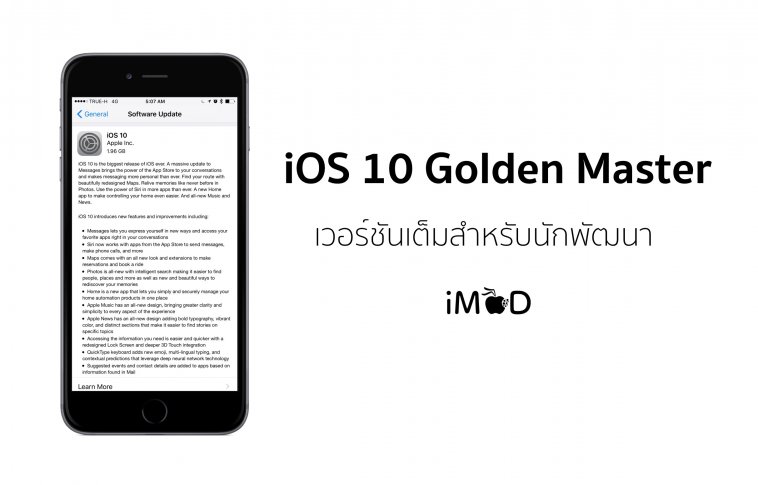iOS 10 Golden Master หรือพูดให้เข้าใจกันง่ายๆ คือ เวอร์ชันเต็มสำหรับนักพัฒนาเท่านั้น โดยภายในนั้นจะเหมือนกับที่จะปล่อยให้กับบุคคลทั่วไปได้ใช้งานนั่นเองครับ