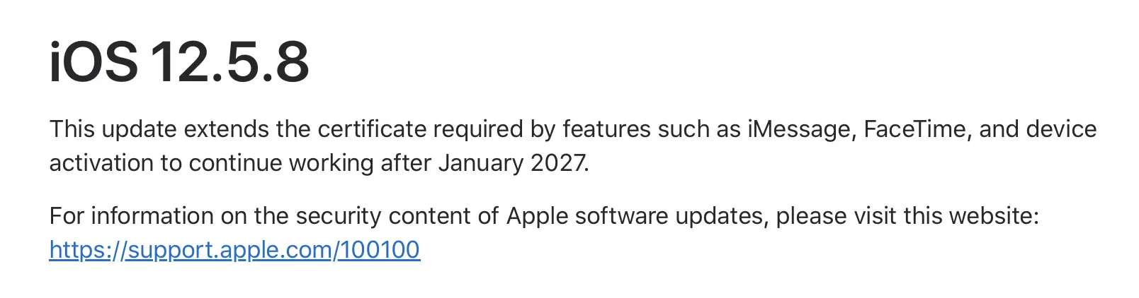รายละเอียดอัปเดตระบุว่า iOS 12.5.8 ได้ขยายอายุใบรับรอง (certificate) ที่จำเป็นสำหรับการใช้งานฟีเจอร์ต่าง ๆ เช่น iMessage, FaceTime และการเปิดใช้อุปกรณ์ (device activation) เพื่อให้ยังสามารถใช้งานได้ต่อไปหลังเดือน ม.ค. 2027
