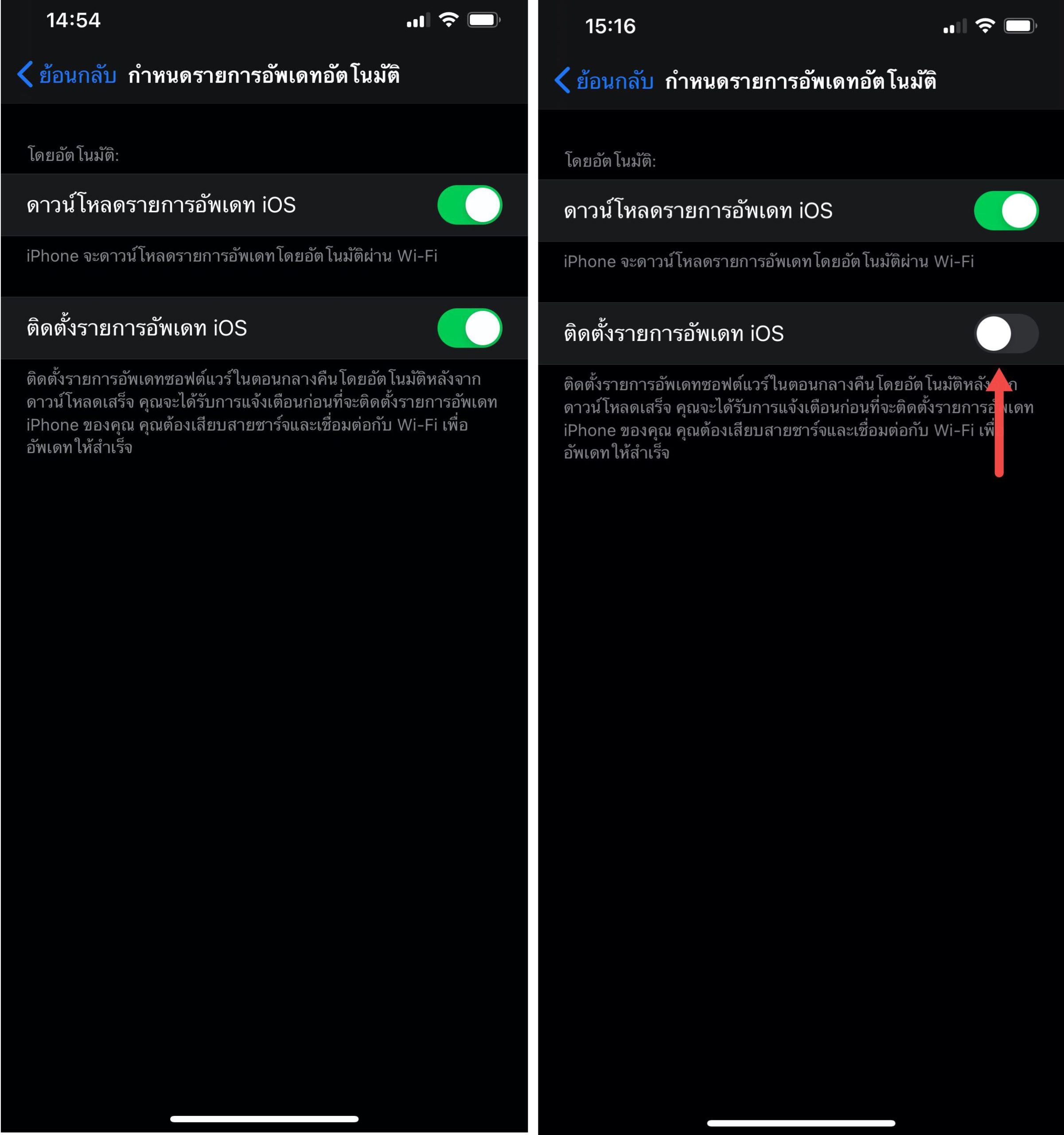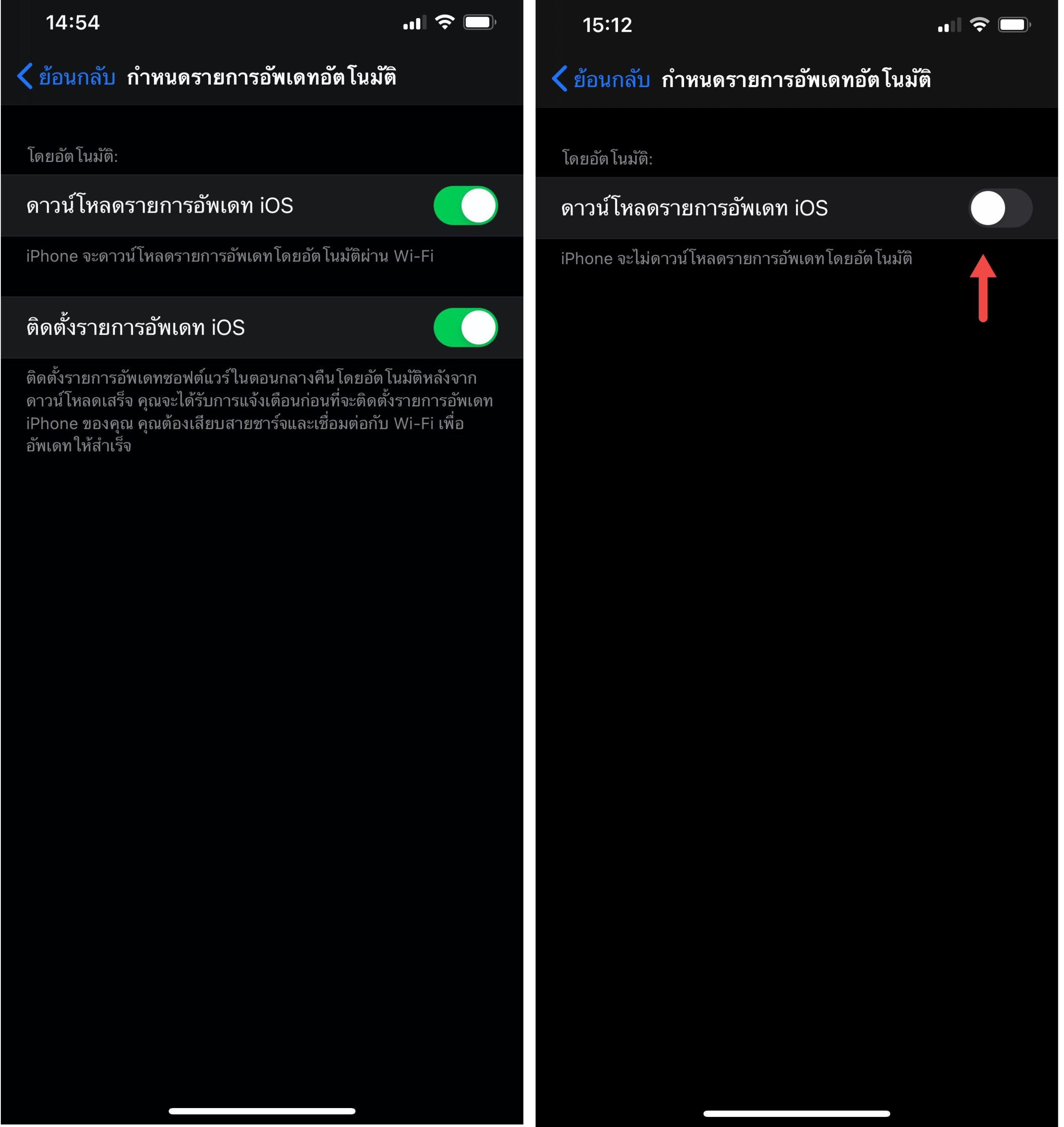 หรือจะเลื่อนปิดเฉพาะ “ติดตั้งรายการอัปเดต iOS” เพื่อให้ระบบดาวน์โหลดรายการอัปเดต iOS มาเก็บไว้ที่เครื่องโดยอัตโนมัติ แต่ไม่ติดตั้งรายการอัปเดต iOS โดยอัตโนมัติก็ได้