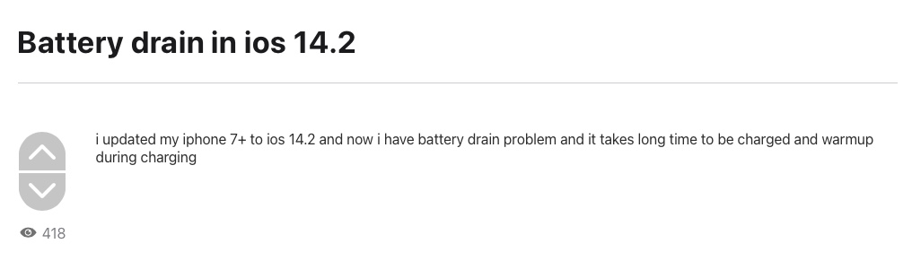 รายงานเผยว่า iPhone ที่อัปเดตเป็น iOS 14.2 แบตหมดไวกว่าปกติ, ผู้ใช้บางคนเผยว่าแบตลดลงไป 50% ภายใน 30 นาที, แบตลงไป 45% ในข้ามคืน, แบตลงไปราว ๆ 5% ต่อนาทีจากการใช้ปกติ เป็นต้น