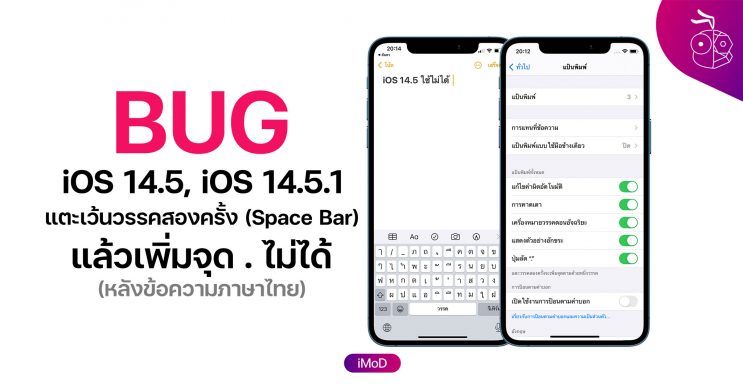 ปกติแล้วใน iOS ผู้ใช้สามารถตั้งค่าการแตะเว้นวรรค (Space Bar) สองครั้งเพื่อพิมพ์จุดได้ แต่ใน iOS 14.5, iOS 14.5.1 ใช้งานหลังข้อความภาษาไทยไม่ได้