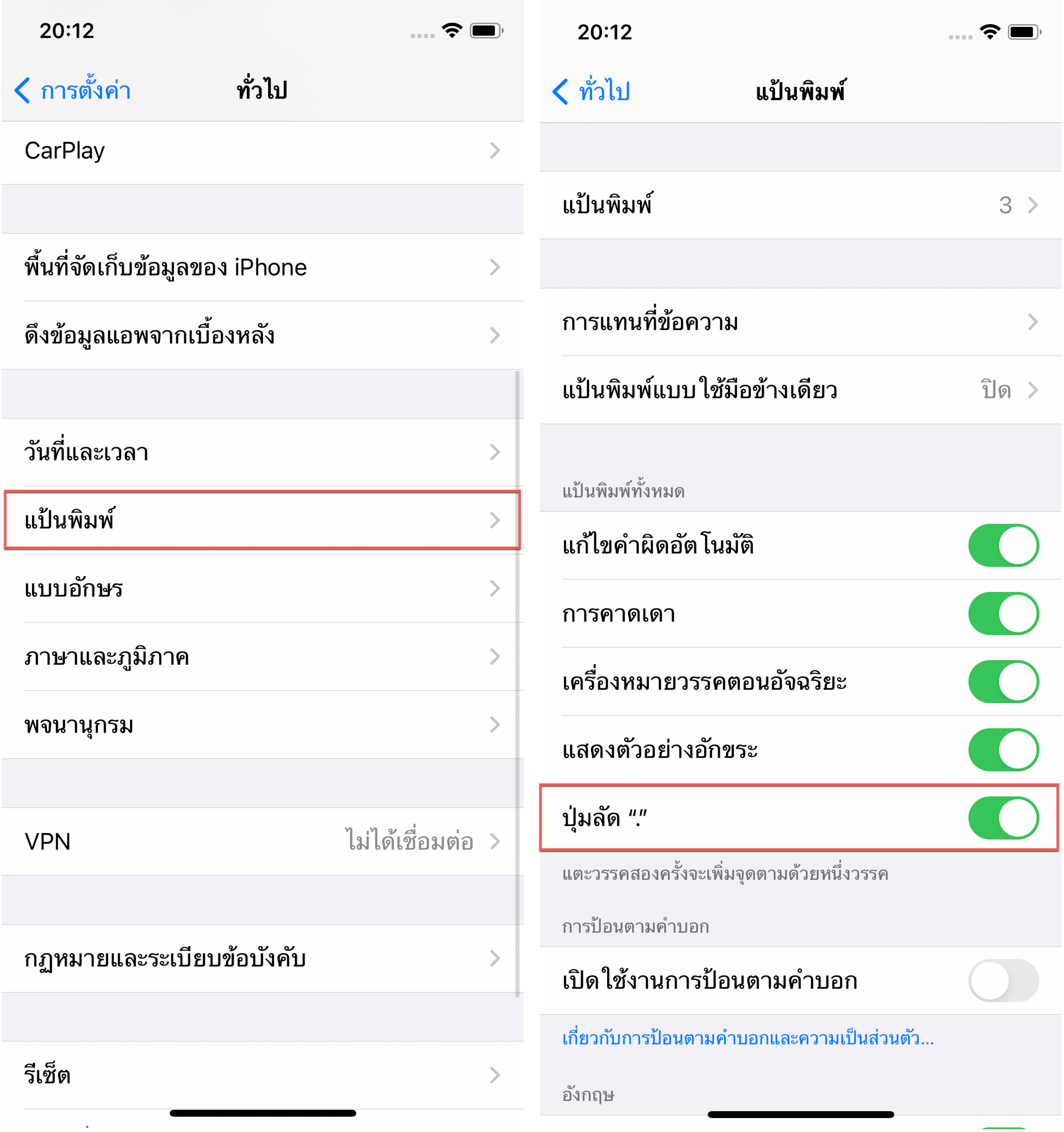 สำหรับการตั้งค่าการแตะเว้นวรรคสองครั้งแล้วเพิ่มจุด . ให้ไปที่การตั้งค่า > ทั่วไป > แป้นพิมพ์ > เลื่อนเปิด “ปุ่มลัด .”