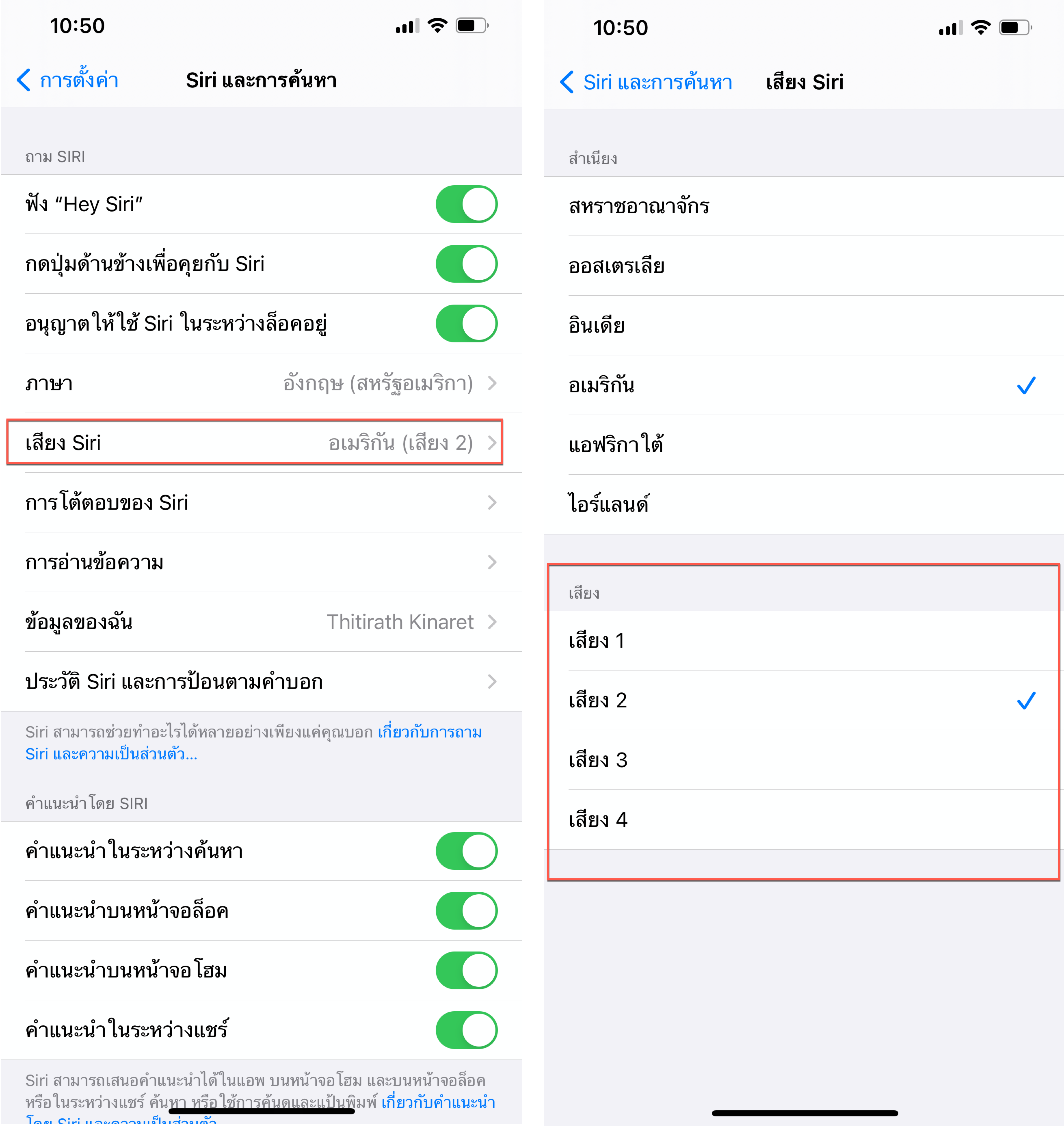 ไปที่การตั้งค่า > Siri และการค้นหา > เสียง Siri (ถ้าเราเลือกภาษาที่รองรับ เช่น อังกฤษ จะมีเมนูนี้ขึ้นมา)