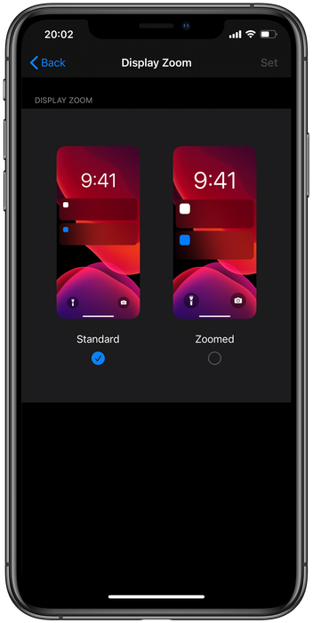 ปกติแล้ว iPhone ตระกูล Face ID จอ 5.8 นิ้ว ได้แก่ iPhone X, iPhone XS, iPhone 11 Pro จะไม่มีตัวเลือกการซูมหน้าจอ ส่วนจอใหญ่เกิน 6 นิ้วอย่าง iPhone XR, iPhone 11, iPhone 11 Pro Max จะสามารถใช้ฟีเจอร์ซูมหน้าจอได้