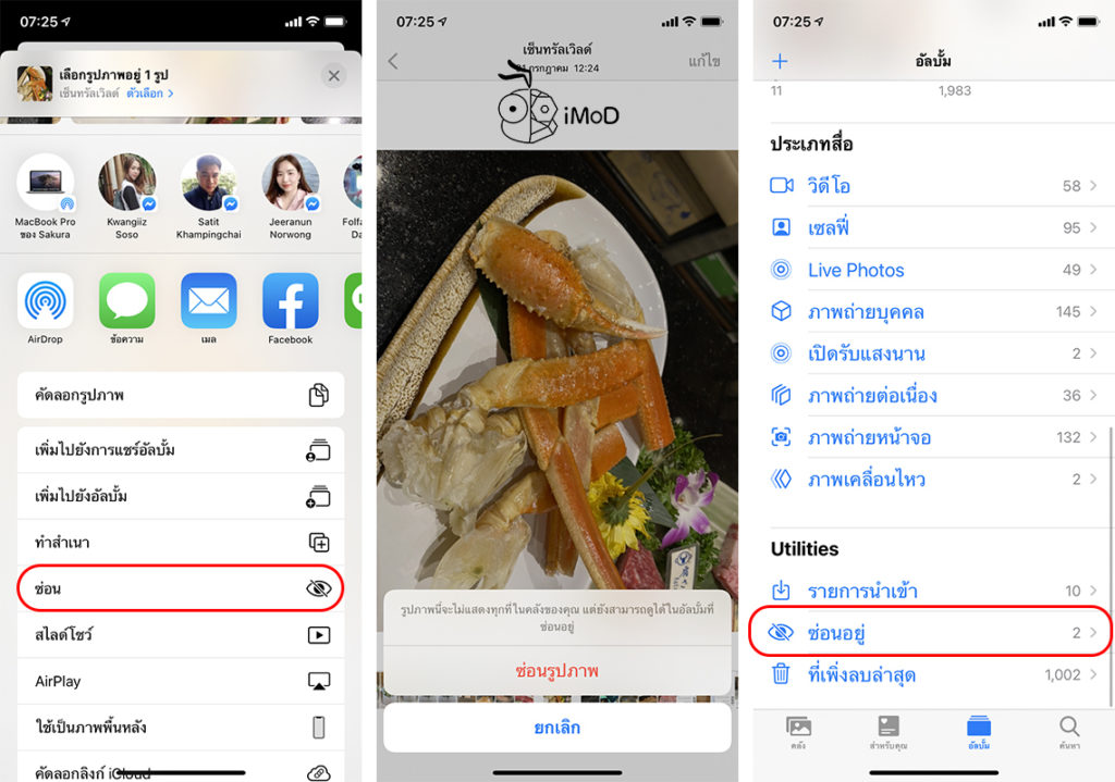 การทำงานของการซ่อนรูปภาพนั้น ยังคงกำหนดการซ่อนรูปเหมือนเดิม ซึ่งรูปภาพที่เราเลือกให้ซ่อนนั้นจะถูกนำไปเก็บในอัลบั้มซ่อน (Hidden) ด้านล่างสุดของแถบอัลบั้มในแอป Photos