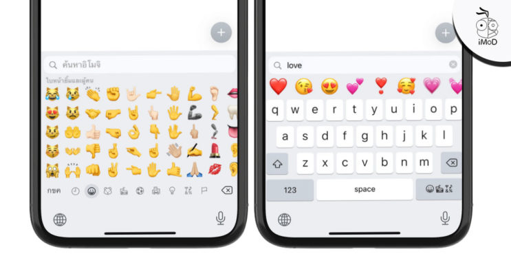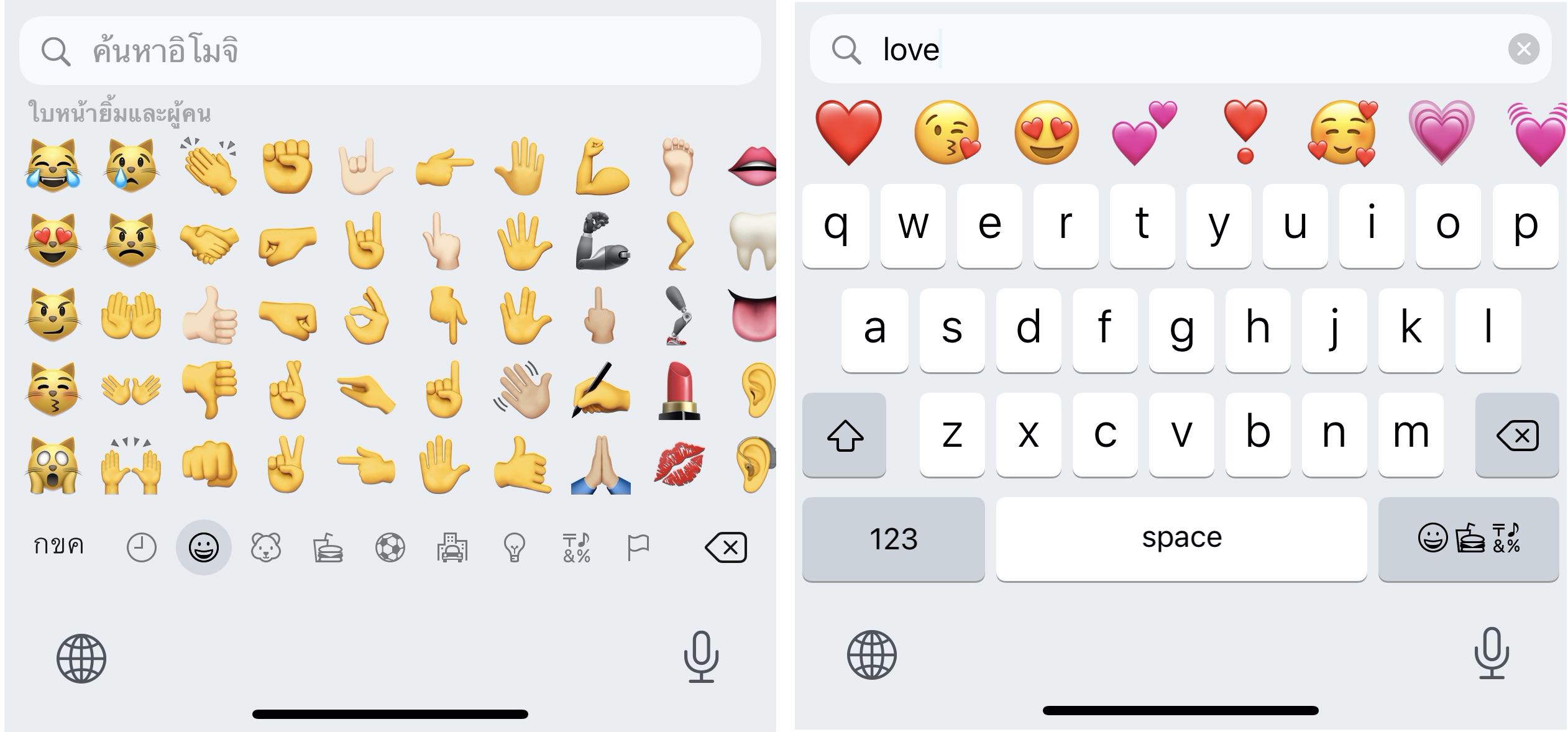 เมื่อเราต้องการใช้ Emoji บนคีย์บอร์ดใน iOS 14 ระบบก็จะขึ้นช่องค้นหาให้ ผู้ใช้สามารถกรอกคำค้นหาทั้งภาษาไทยและอังกฤษในการค้นหา Emoji ที่ต้องการ