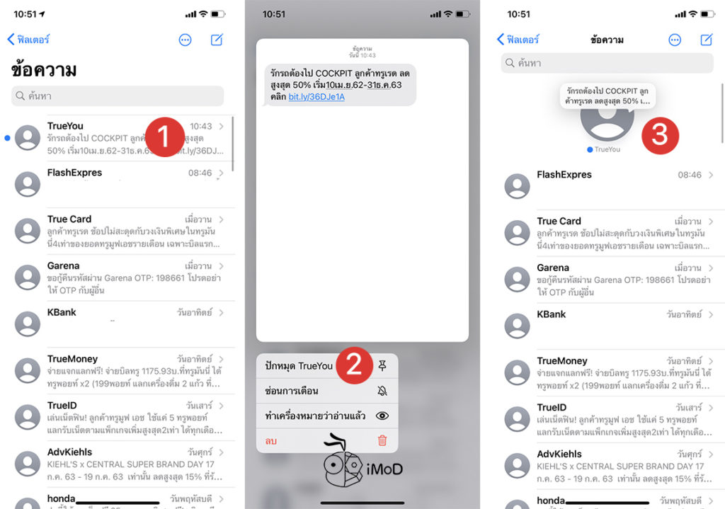 สำหรับข้อความที่เราต้องติดต่ออยู่เป็นประจำ เราสามารถแตะค้างที่เทรดข้อความ แล้วเลือกปักหมุดไว้ด้านบนสุดของแอปได้ เวลาใช้งานครั้งถัดไปก็สามารถแตะที่ไอคอนรายชื่อที่เราปักหมุด เพื่อเริ่มติดต่อได้เลย