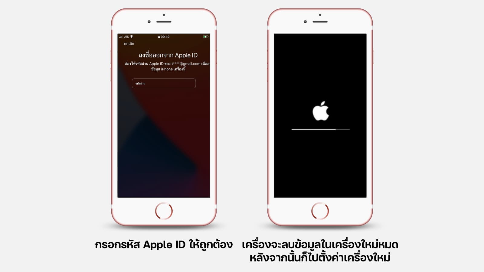 กรอกรหัส Apple ID ให้ถูกต้อง จากนั้นเครื่องและระบบจะทำการลบข้อมูลทั้งหมดในเครื่องออกไป เมื่อเสร็จแล้วจะสามารถเข้าไปใช้งานและตั้งค่าเครื่องใหม่ได้