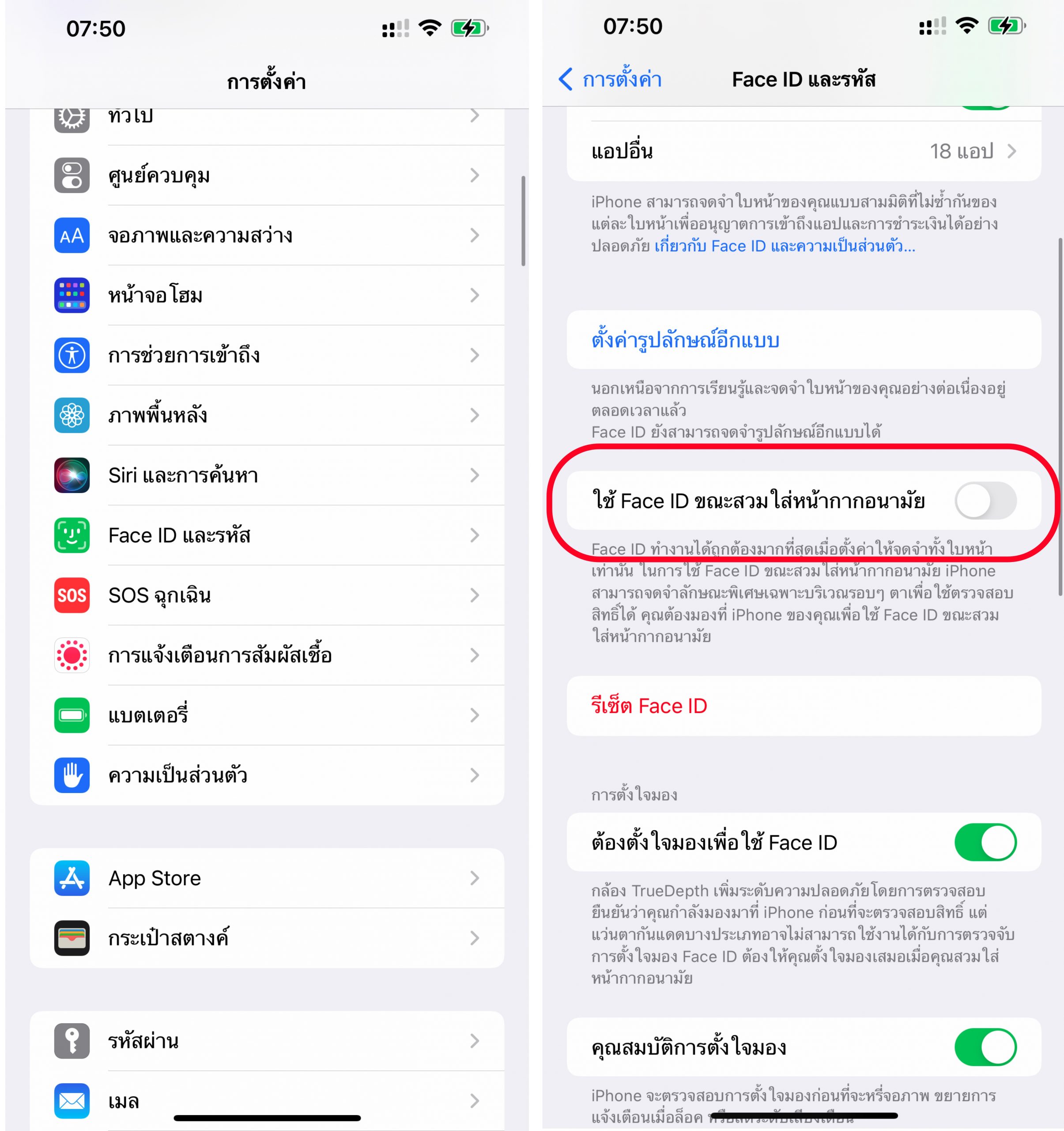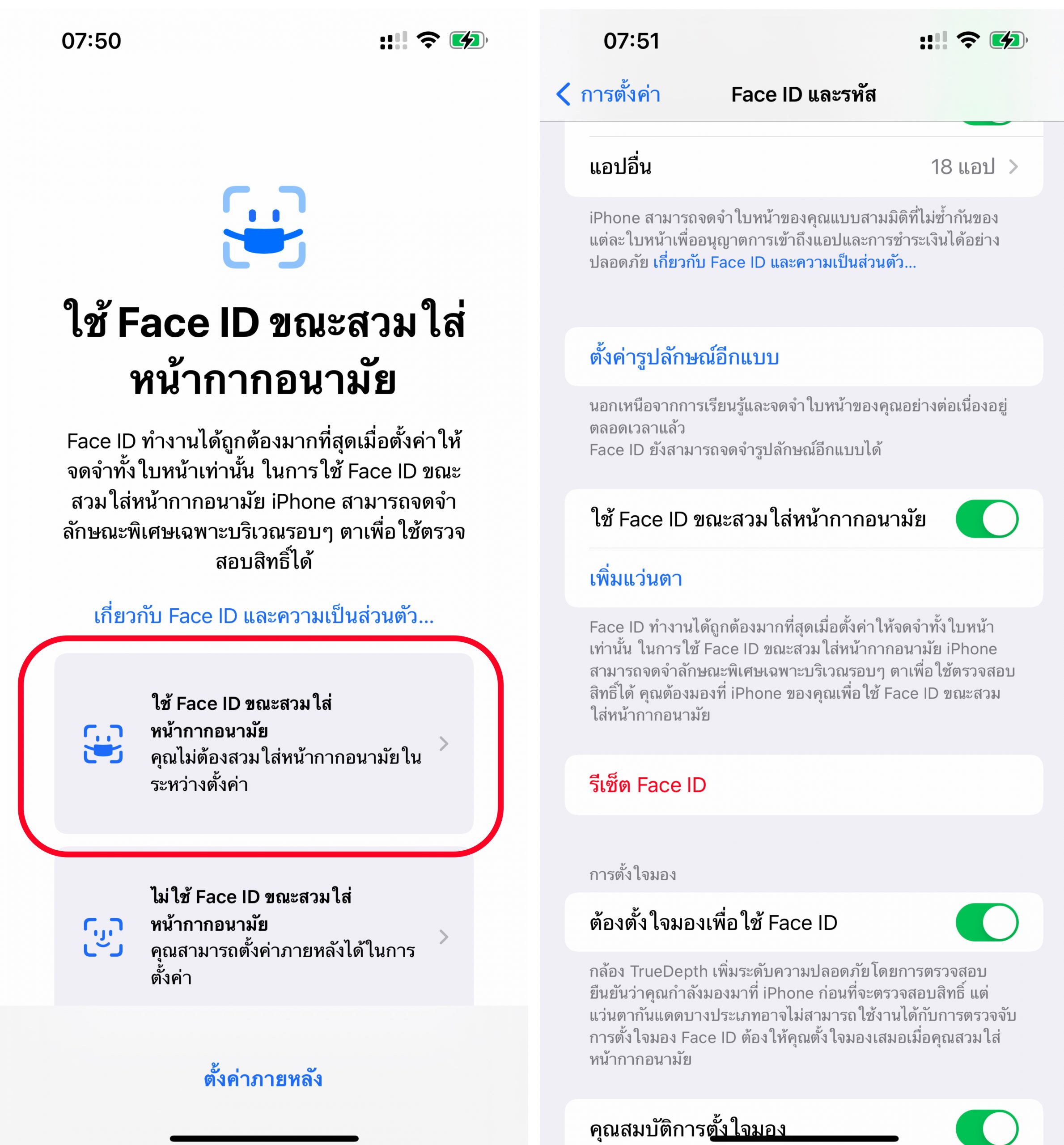 เข้าไปที่การตั้งค่า > Face ID และรหัส > เลื่อนเปิด ใช้ Face ID ขณะสวมใส่หน้ากากอนามัย > ตั้งค่าใบหน้าตามขั้นตอนให้เสร็จ