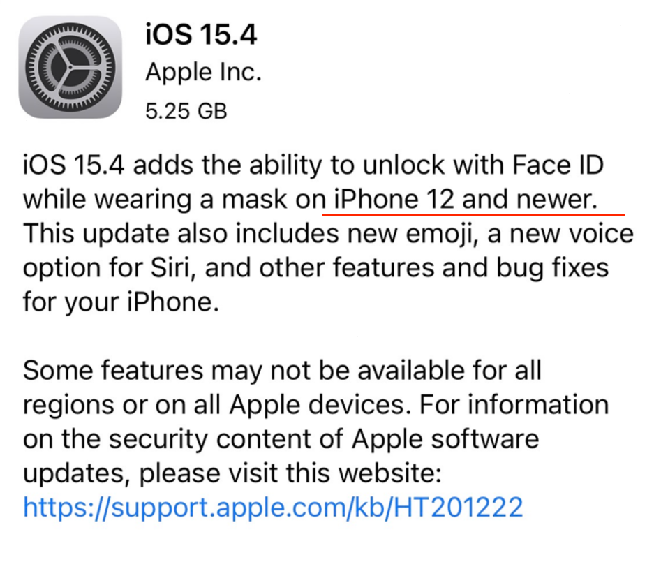 ฟีเจอร์ สแกนหน้า (Face ID) ขณะสวมใส่หน้ากากอนามัย ใน iOS 15.4 รองรับ iPhone 12 หรือใหม่กว่า, iPhone รุ่น Face ID รุ่นเก่าไม่รองรับฟีเจอร์นี้