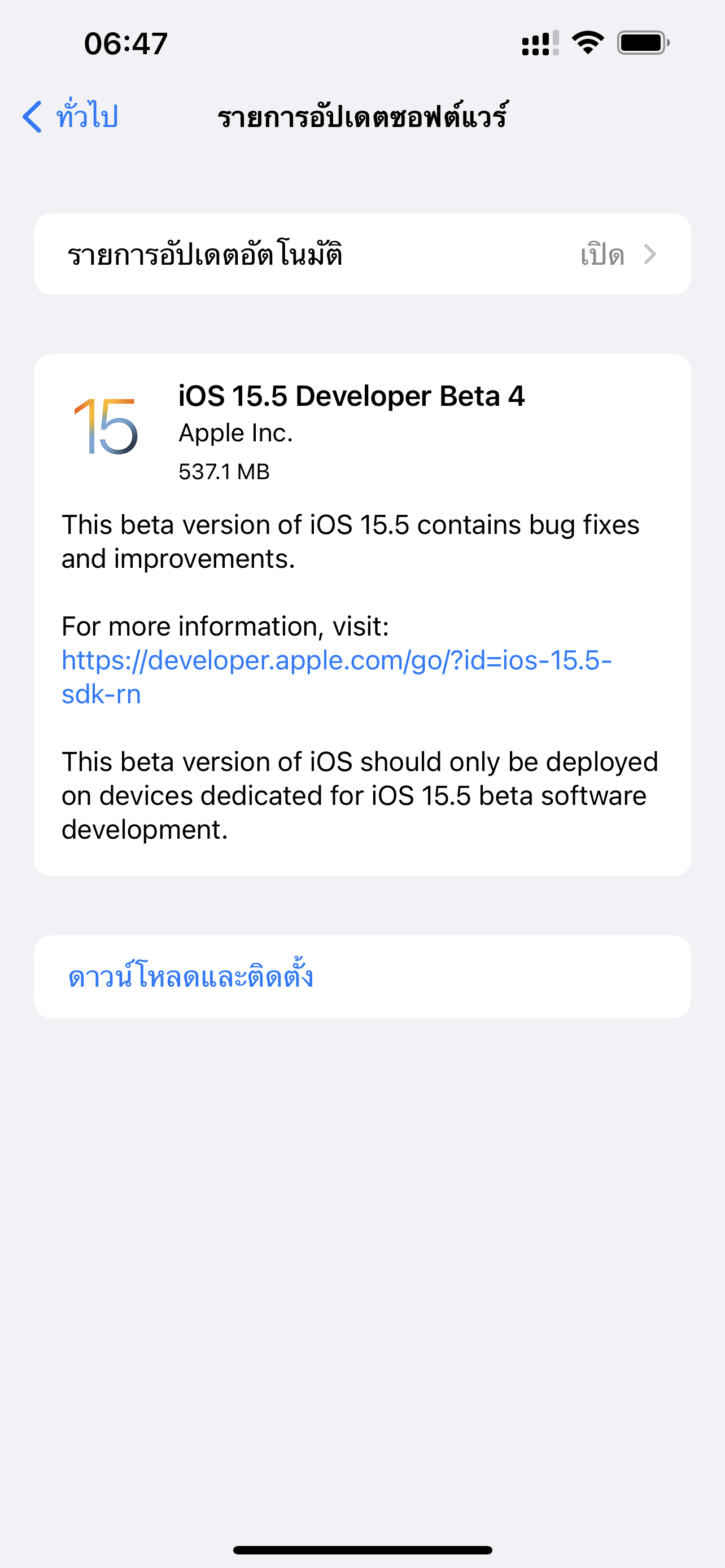 Apple ปล่อย iOS 15.5 Developer Beta 4 ให้นักพัฒนาทดสอบ โดยเวอร์ชันนี้เน้นแก้ปัญหาจากเวอร์ชันก่อนหน้า นักพัฒนาที่ลงทะเบียนทดสอบไว้อัปเดตทดสอบได้เลย