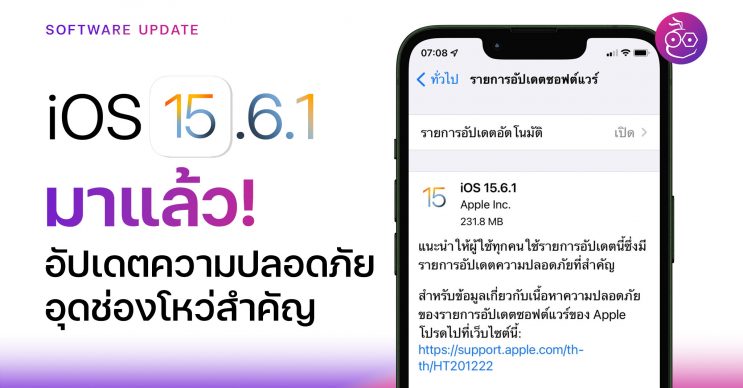 Apple ปล่อย iOS 15.6.1, iPadOS 15.6.1 ให้ผู้ใช้ทั่วไปได้อัปเดต โดยในเวอร์ชันนี้อัปเดตความปลอดภัย อุดช่องโหว่สำคัญ ผู้ใช้ทั่วไปควรอัปเดต
