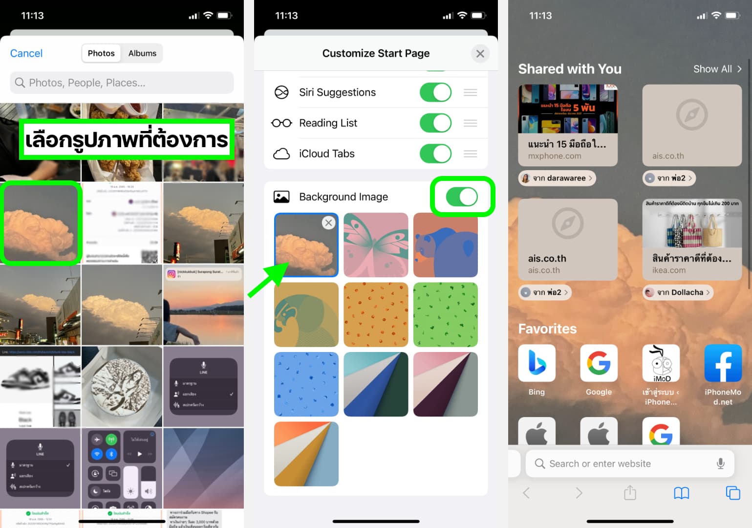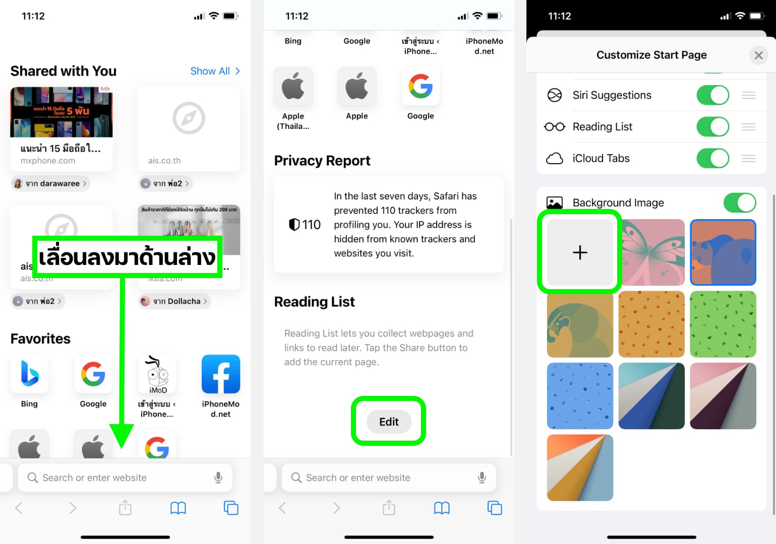 เมื่อเปิดเข้าไปที่หน้าแรกของ Safari ให้เลื่อนลงมาด้านล่างสุด จะเจอกับคำว่า “Edit” > เลื่อนเปิด Background Image > แตะที่เครื่องหมายบวกเพื่อเพิ่มภาพพื้นหลัง (สามารถเลือกรูปที่มีให้ หรือเพิ่มรูปภาพจากอัลบั้มรูปภาพก็ได้)