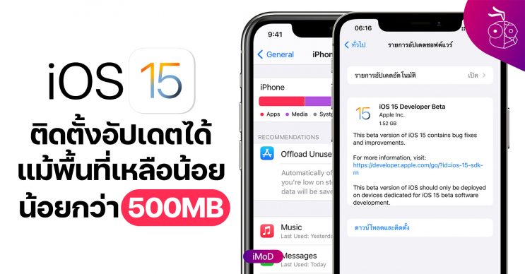 ใน iOS 15, iPadOS 15, watchOS 8 Beta 3 นั้น ผู้ใช้สามารถติดตั้งอัปเดตซอฟต์แวร์ได้ ถึงแม้พื้นที่ตัวเครื่องจะเหลือน้อยกว่า 500MB