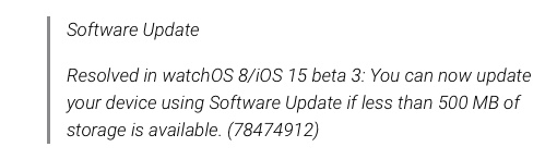 ในเอกสารอัปเดตของ iOS 15, iPadOS 15, watchOS 8 เวอร์ชัน Developer Beta ระบุว่าได้แก้ปัญหาการติดตั้งอัปเดตซอฟต์แวร์สำหรับอุปกรณ์ผู้ใช้ที่มีพื้นที่เหลือน้อยแล้ว