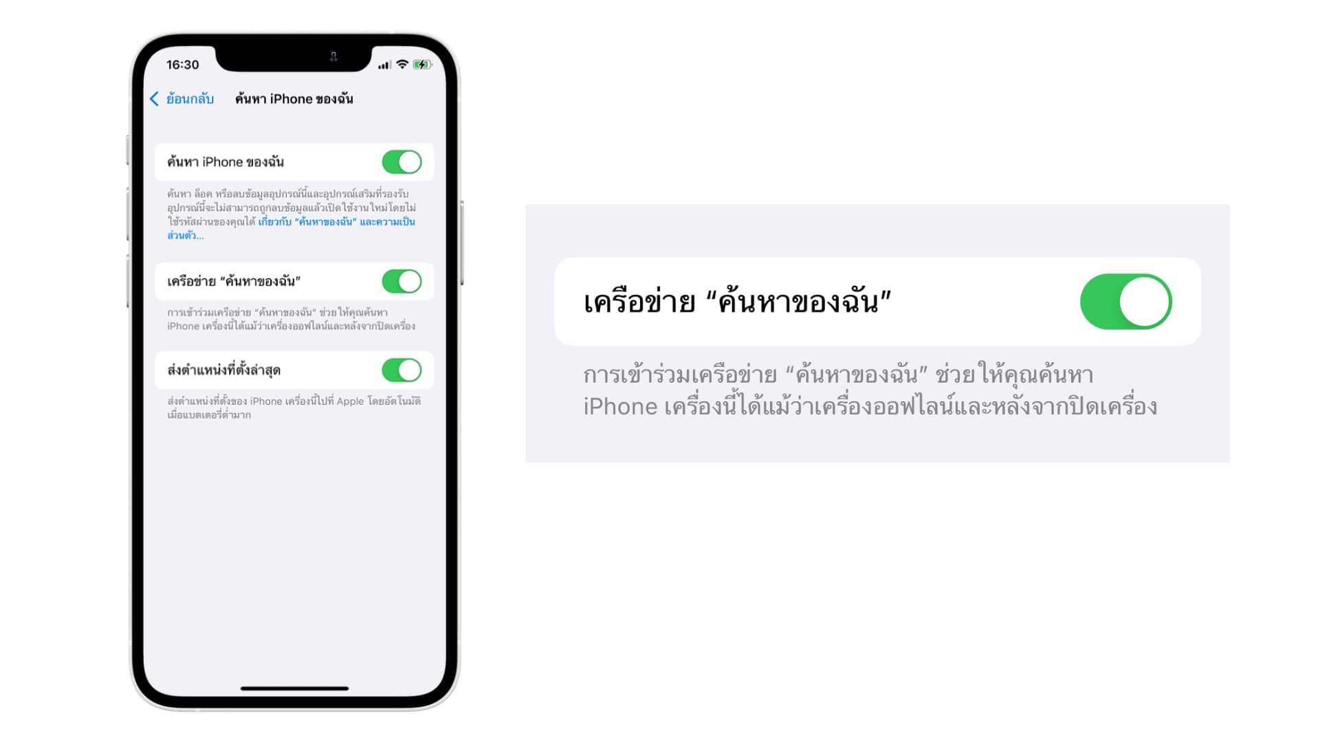 ค้นหา iPhone ได้แม้ปิดเครื่อง ด้วยเครือข่าย “ค้นหาของฉัน” เมื่อทำการเลื่อนเพื่อปิดเครื่อง iPhone จะแจ้งว่า “สามารถค้นหา iPhone ได้หลังจากปิด”